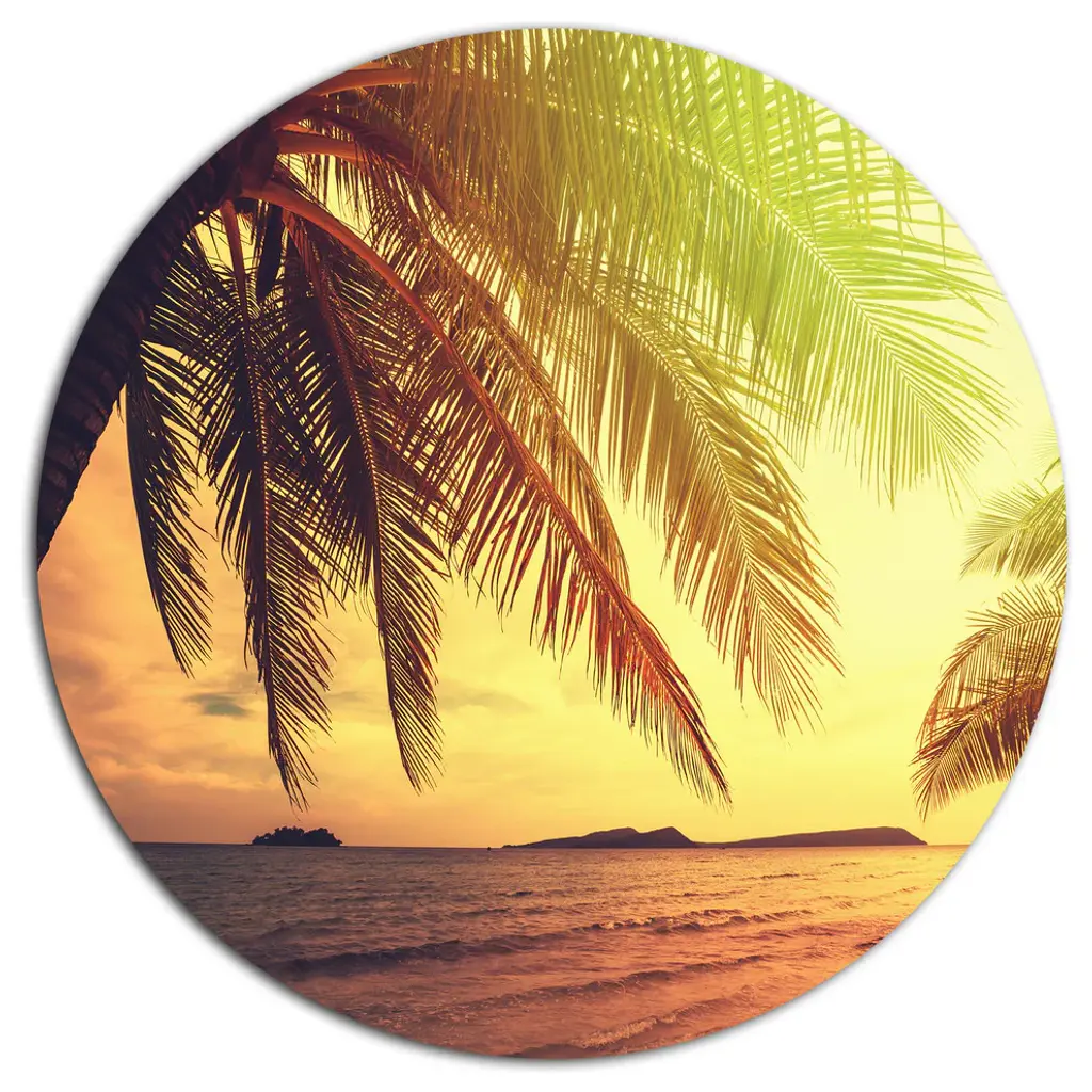 Bring Contemporary Abstraction to your home with this large Circle Metal wall art. This Tropical Beach with Green Palm Metal Artwork makes it the focal point of any room or office. - White Gloss Coating ensures colors are extra vibrant with light reflection.- Aluminum grade Sheet Metal with 1 inch mounting frame on the back giving the illusion that the artwork is floating on the wall..- Mounting Brackets are included along with instructions.- High Quality Digital images are created directly into a glossy aluminum panel producing a stunning and captivating print into the glossy finish of the metal.- Water, Fire and Scratch resistant HD Aluminum panels.- Looks better than any photo paper and guaranteed to last at least 20 years- Easy to clean with a microfiber cloth. Colors are far superior to regular Canvas Art. - Easy to Hang