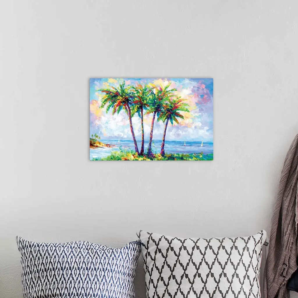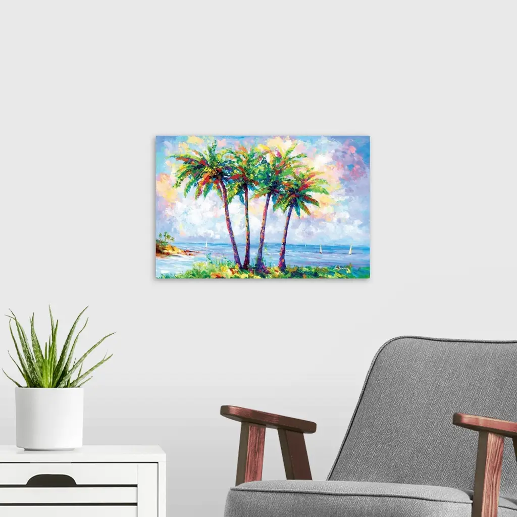 Vibrant and colorful contemporary painting of a tropical beach with palm trees in Oahu, Hawaii.