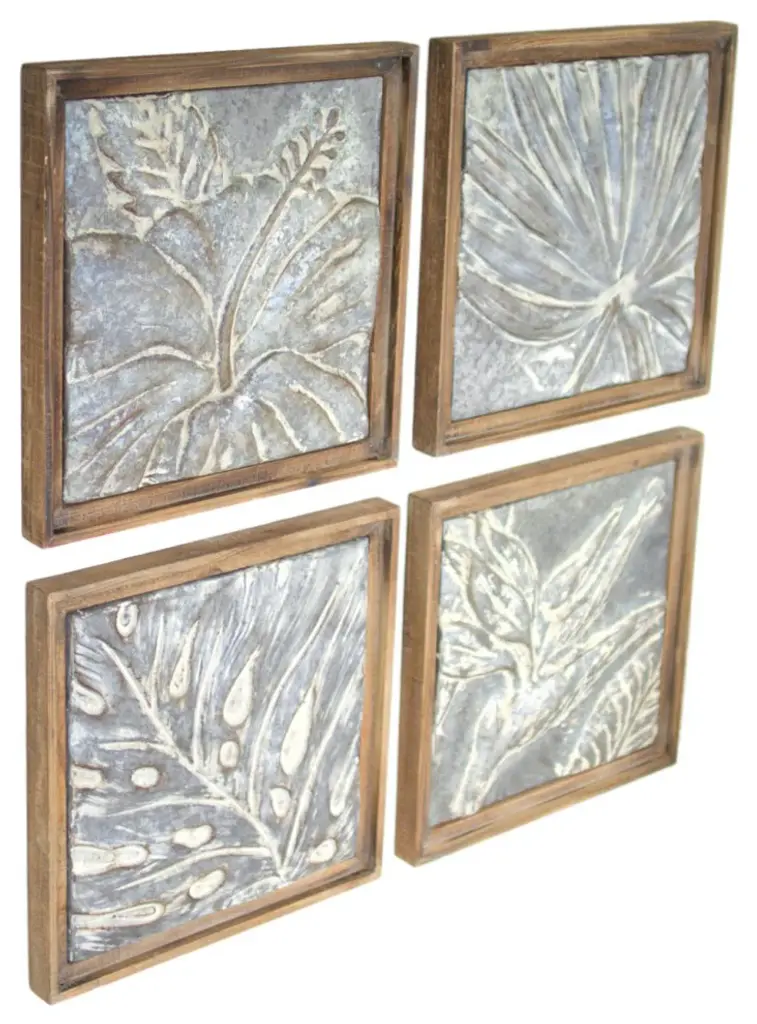 Bring the beauty of nature to your walls. Makes a great conversation piece.- Includes four frames tiles, one each of the styles shown. Each tile measures 18" x 18"t.- Hand finished metal- Attaches securely to the wall.- Heirloom Quality - Expertly hand crafted and hand finished. Due to the hand crafted nature of this piece, each piece may have subtle differences.