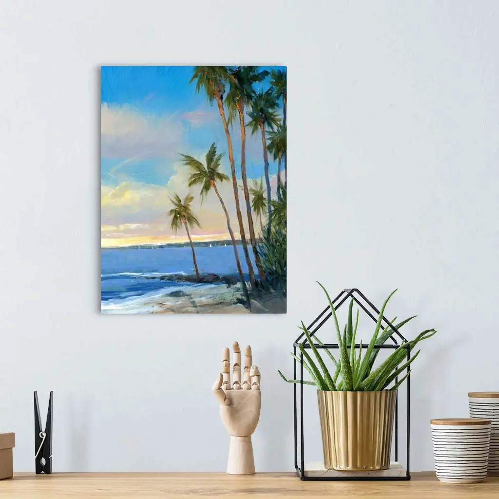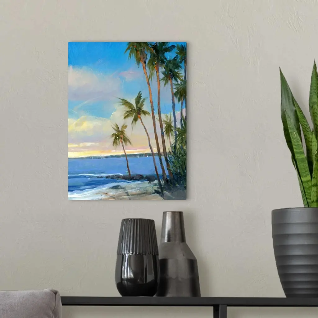 This is a vertical painting of slender palm trees going on the edge of the shore of a sandy beach.