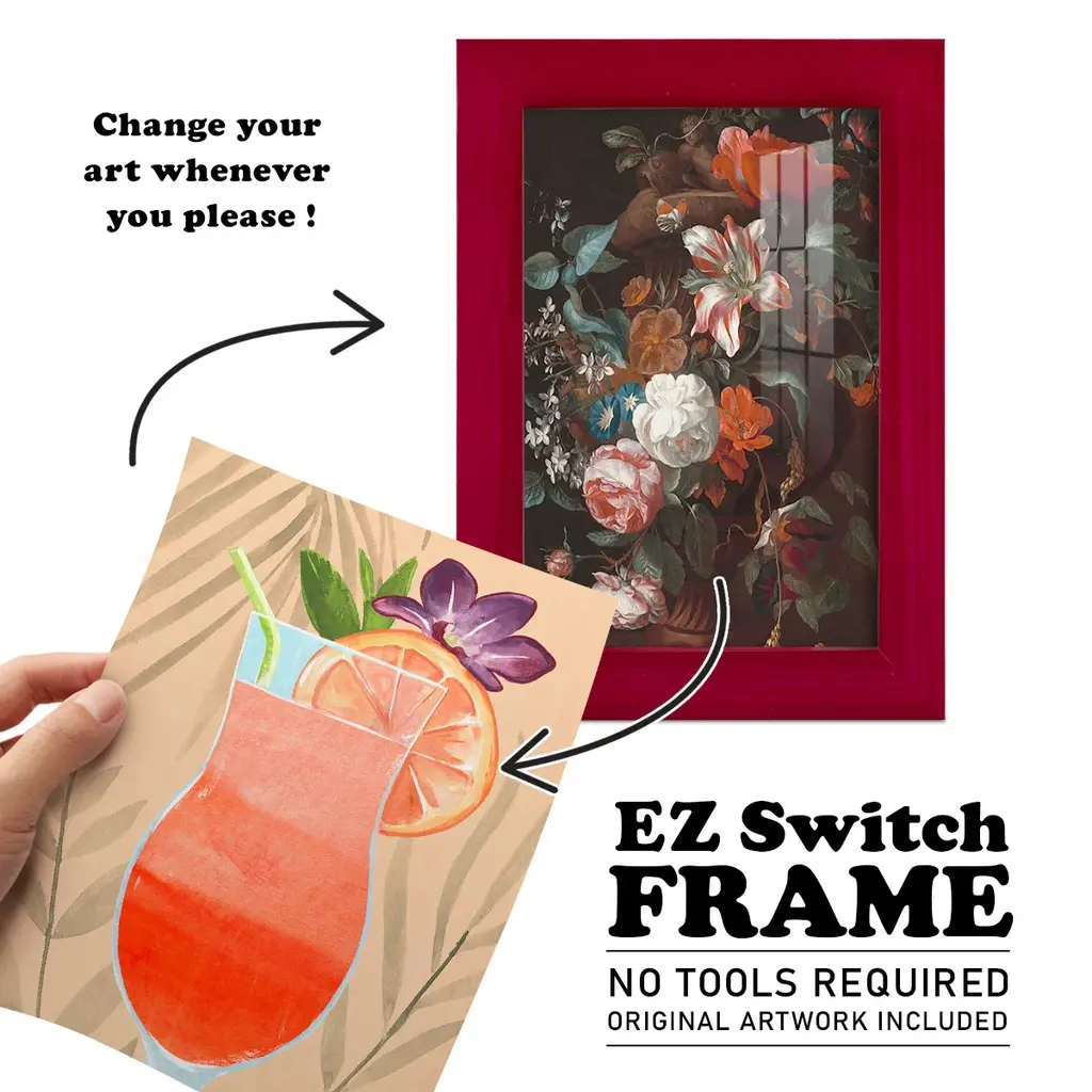 Tropical Cocktail III -EZ SWITCH Framed Print w/glass-Cherry Red A delightful, framed print. Featuring a solid wood frame with real wood glass. This premium print is giclee quality. In addition, every frame features a removable back and table top stand. This allows you to change your art in the future or to just stand the art on a table for a new look. We are sure you'll enjoy our new series of EZ SWITCH Framed Art. Solid Wood Frame Real Glass Removable / Replaceable Art Built in Tabletop Stand Sizes range from 4x6 up to 12x15 - buy just one or pair them up as sets as you see fit.