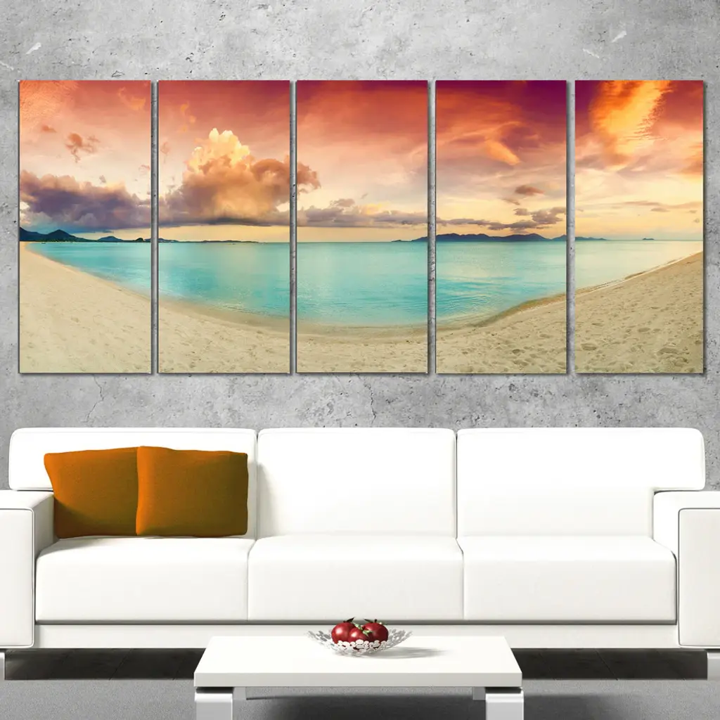 "Tropical Colorful Sunset With Pond" Landscape Canvas Print, 5 Panels, 60"x28"
