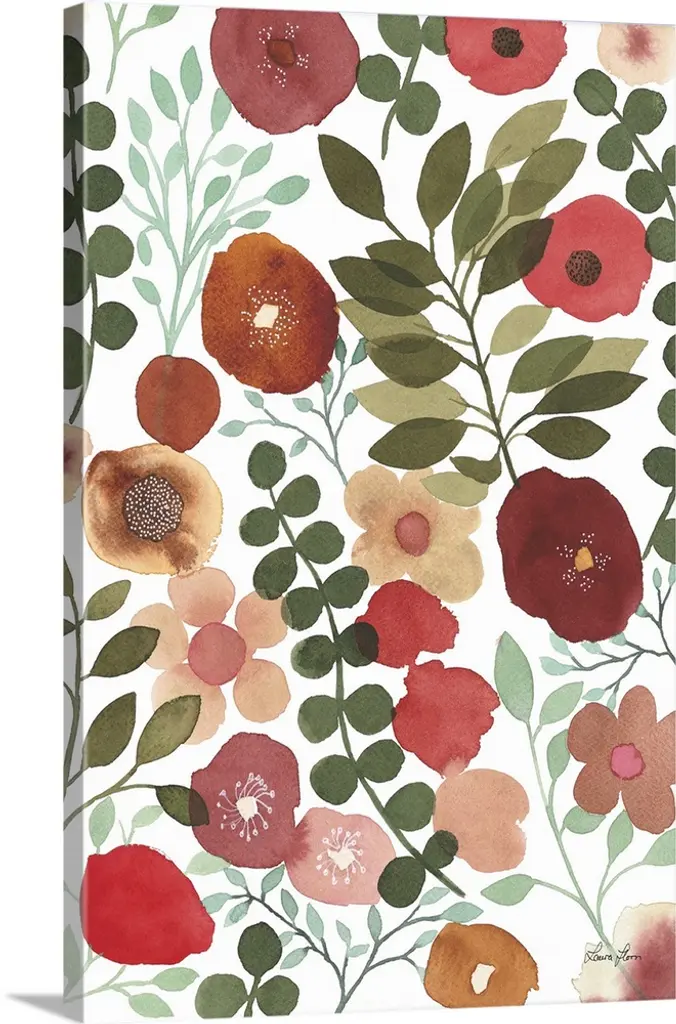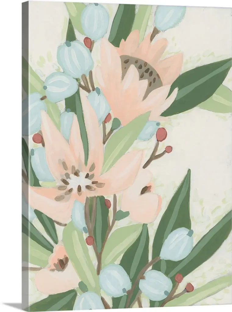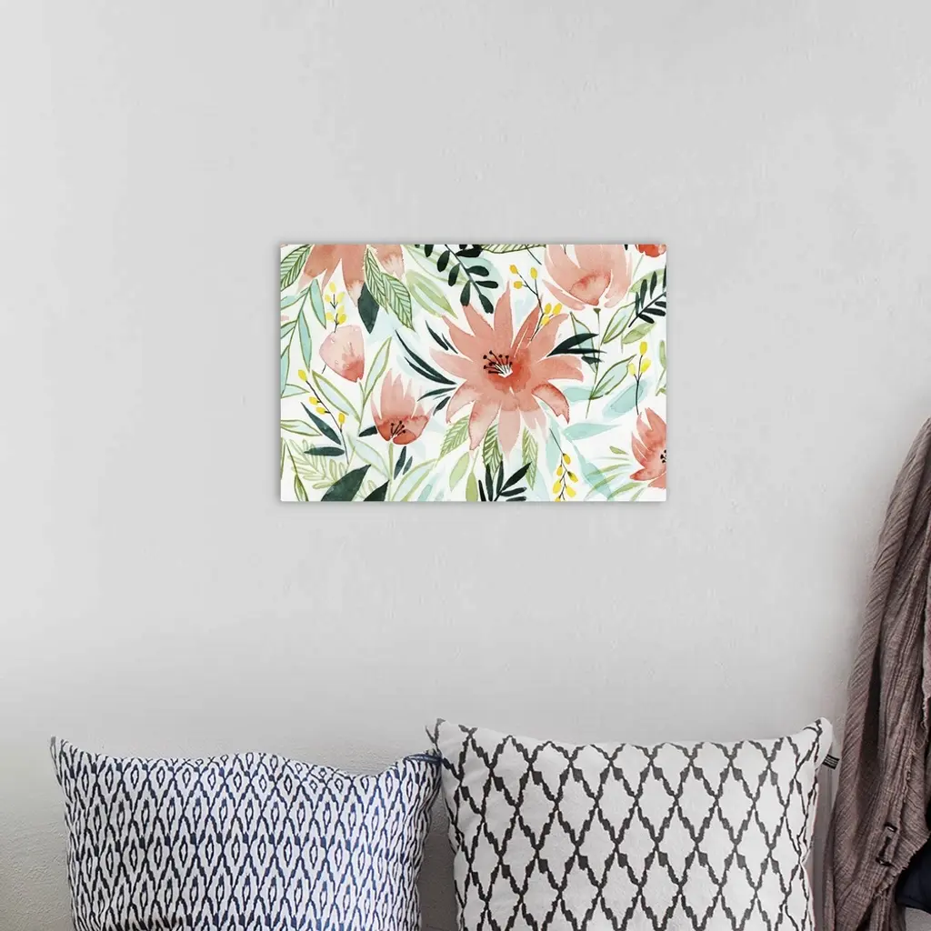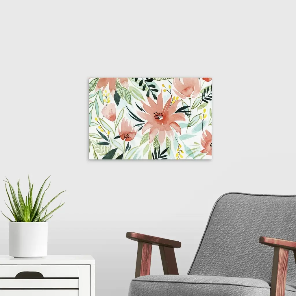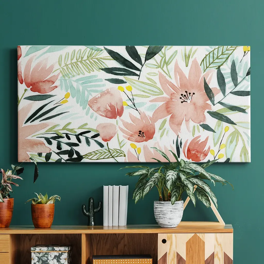 Watercolor painting of tropical pink flowers surrounded by green and blue leaves and greenery with a few small yellow blossoms on a white background.