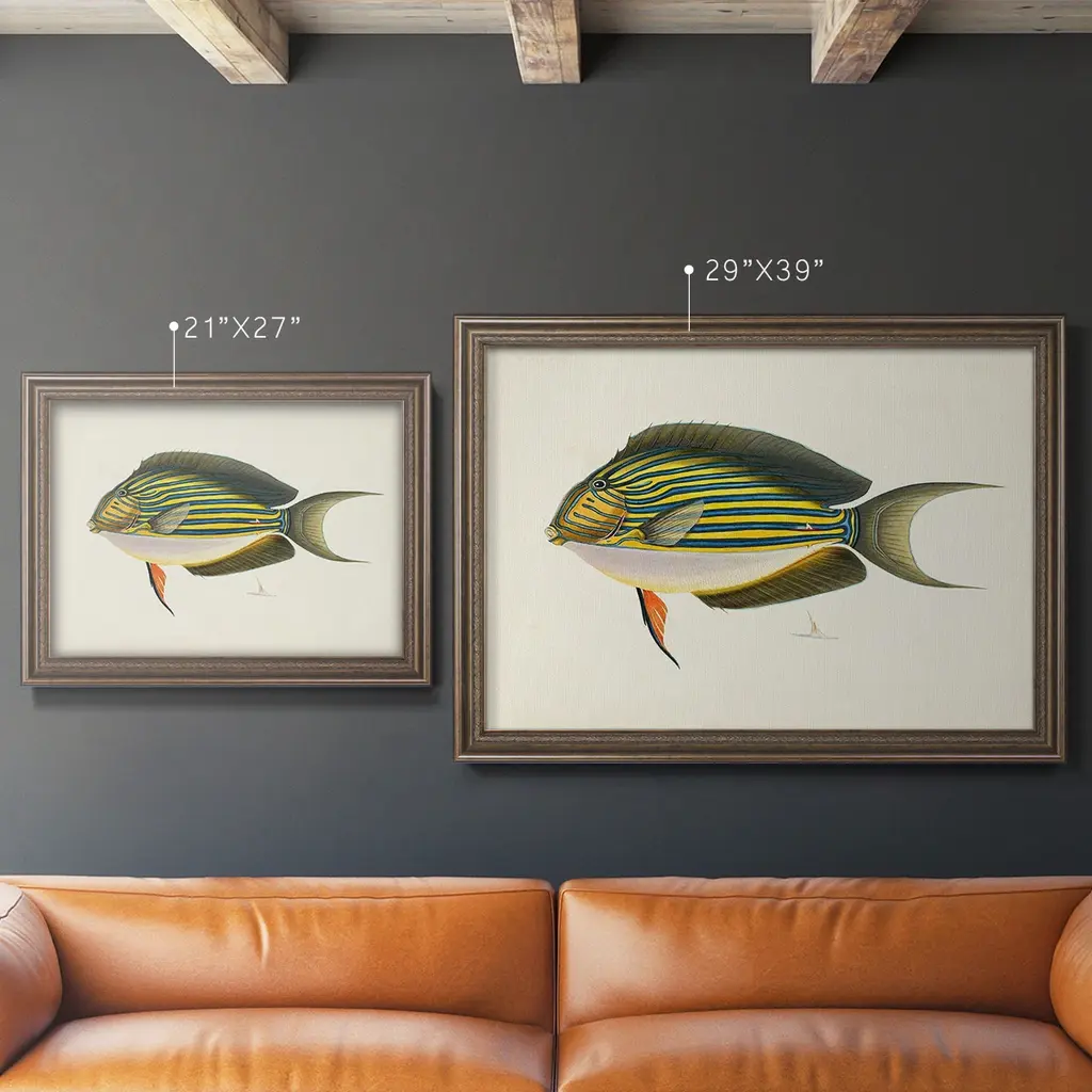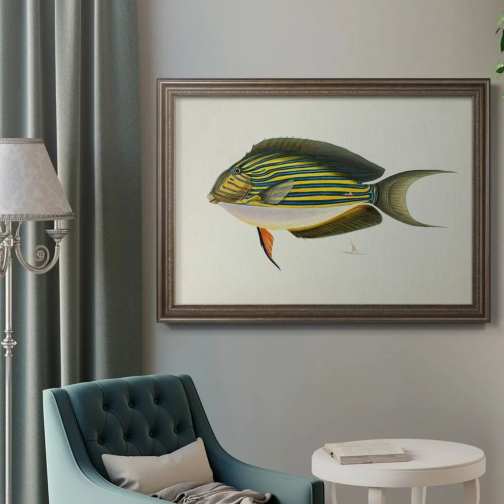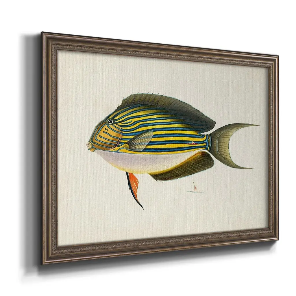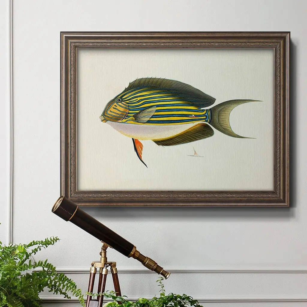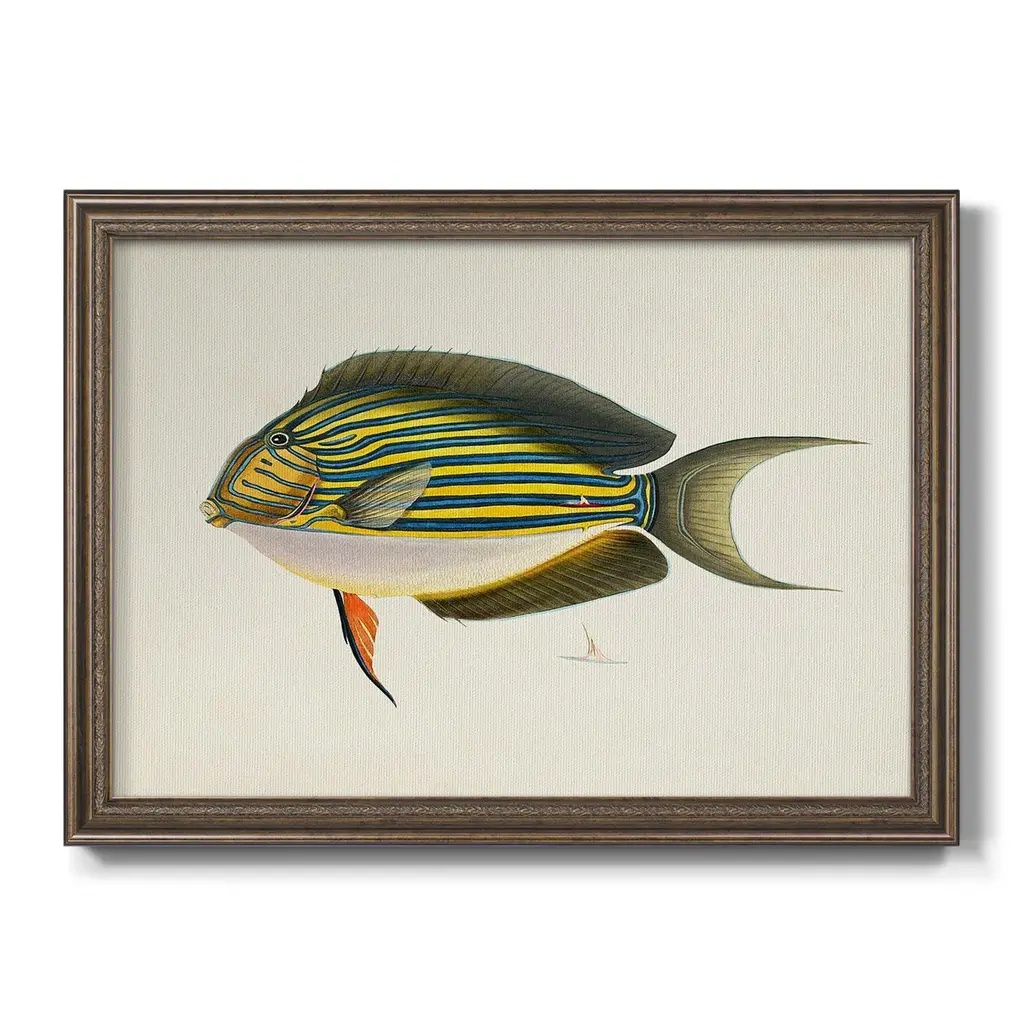 Tropical Fish Collection I Premium Framed Canvas- Ready to Hang A Premium Framed Canvas created to last. Framed in distressed wood and available in an array of sizes and colors Featuring a beveled a solid wood stretcher bar, each piece comes ready to hand 3 SIZES AVAILABLE 16''X20'' - Overall Size 18'X27'' - Overall Size 24''x36'' - Overall Size Each piece is made to order. Each piece comes with hanging hardware. Made in the USA Ready to Hang Giclee Paper Print Acrylic Glass Beveled Matt Board