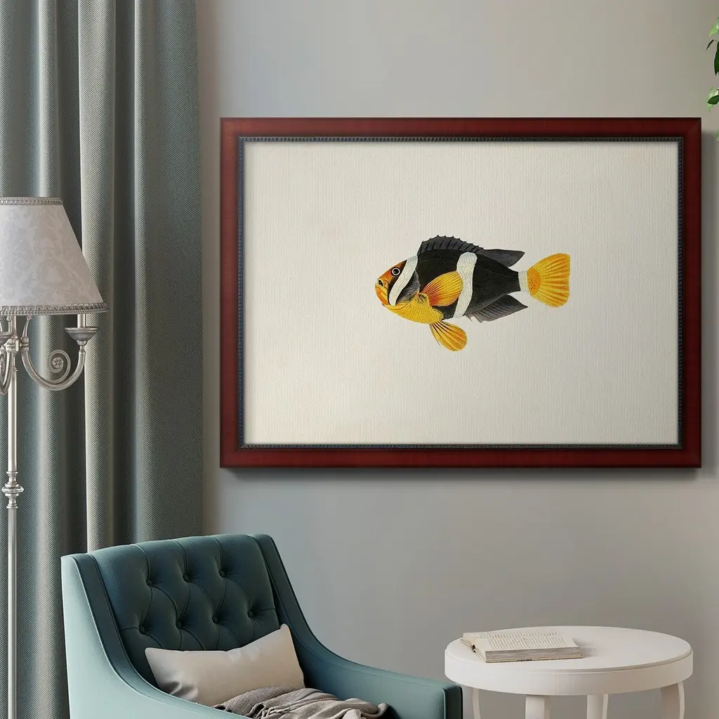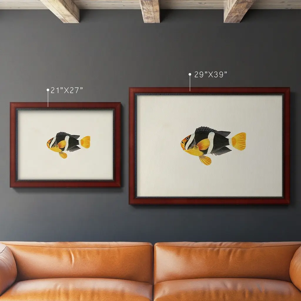 Tropical Fish Collection II Premium Framed Canvas- Ready to Hang A Premium Framed Canvas created to last. Framed in distressed wood and available in an array of sizes and colors Featuring a beveled a solid wood stretcher bar, each piece comes ready to hand 3 SIZES AVAILABLE 16''X20'' - Overall Size 18'X27'' - Overall Size 24''x36'' - Overall Size Each piece is made to order. Each piece comes with hanging hardware. Made in the USA Ready to Hang Giclee Paper Print Acrylic Glass Beveled Matt Board