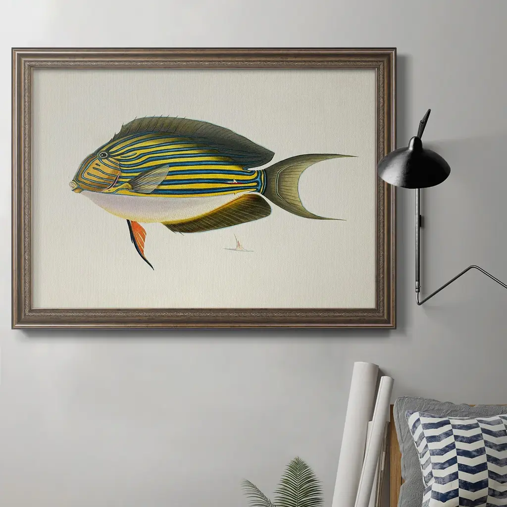 Tropical Fish Collection IV Premium Framed Canvas- Ready to Hang A Premium Framed Canvas created to last. Framed in distressed wood and available in an array of sizes and colors Featuring a beveled a solid wood stretcher bar, each piece comes ready to hand 3 SIZES AVAILABLE 16''X20'' - Overall Size 18'X27'' - Overall Size 24''x36'' - Overall Size Each piece is made to order. Each piece comes with hanging hardware. Made in the USA Ready to Hang Giclee Paper Print Acrylic Glass Beveled Matt Board