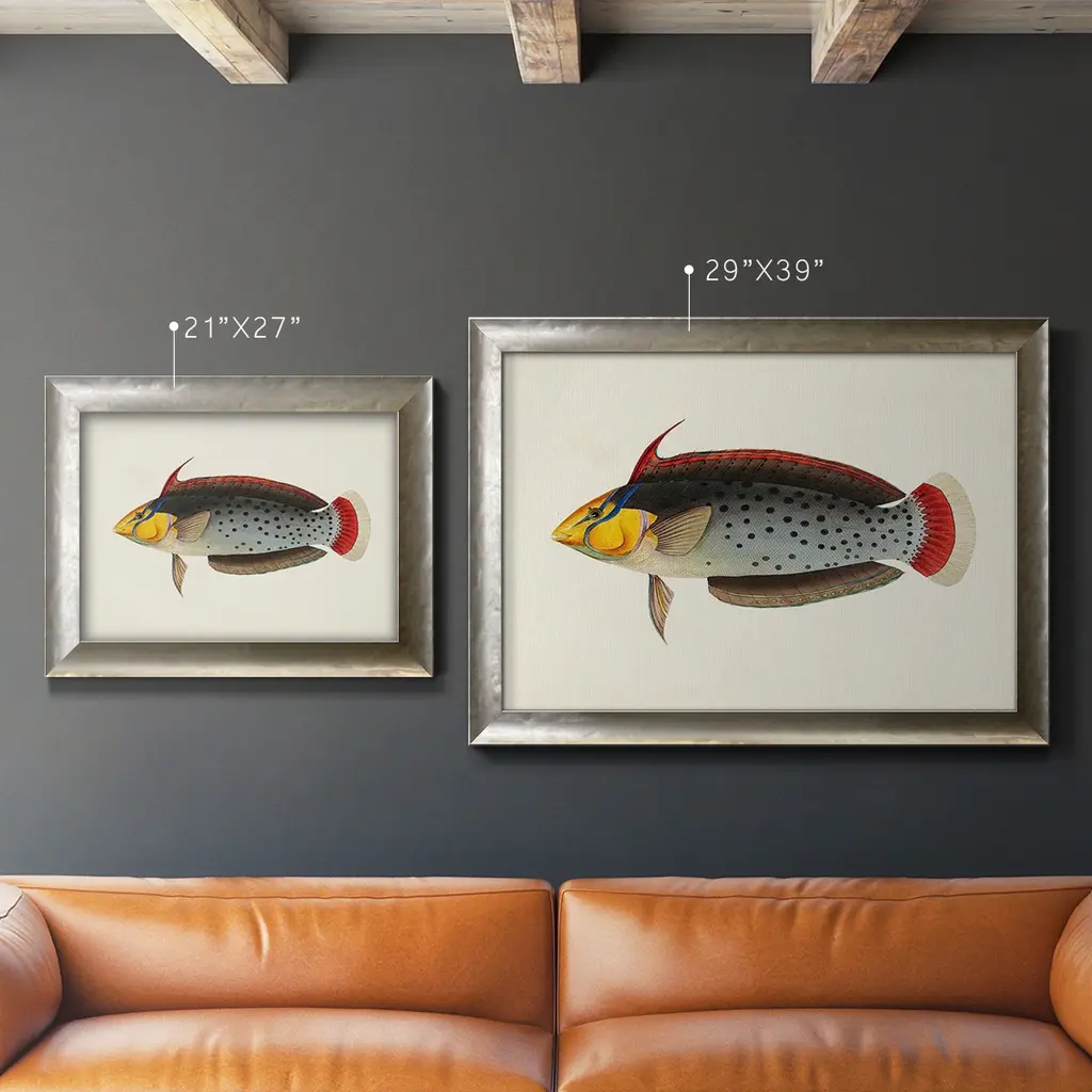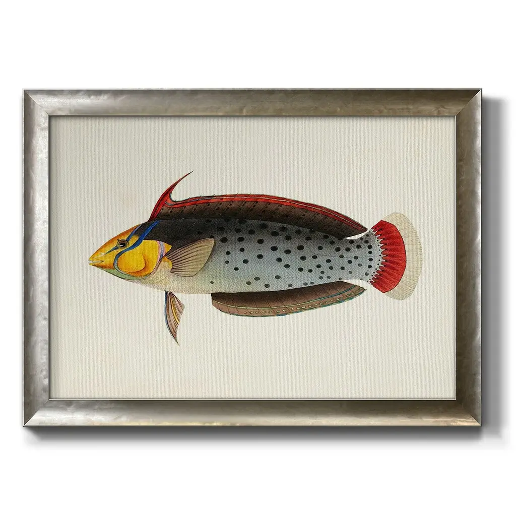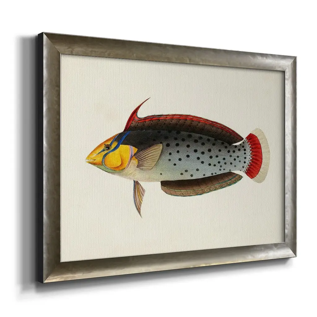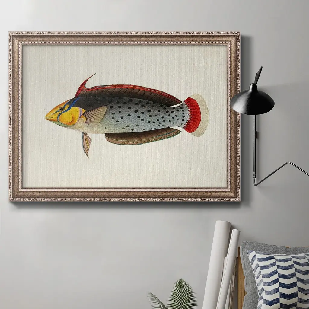 Tropical Fish Collection IV Premium Framed Canvas- Ready to Hang A Premium Framed Canvas created to last. Framed in distressed wood and available in an array of sizes and colors Featuring a beveled a solid wood stretcher bar, each piece comes ready to hand 3 SIZES AVAILABLE 16''X20'' - Overall Size 18'X27'' - Overall Size 24''x36'' - Overall Size Each piece is made to order. Each piece comes with hanging hardware. Made in the USA Ready to Hang Giclee Paper Print Acrylic Glass Beveled Matt Board