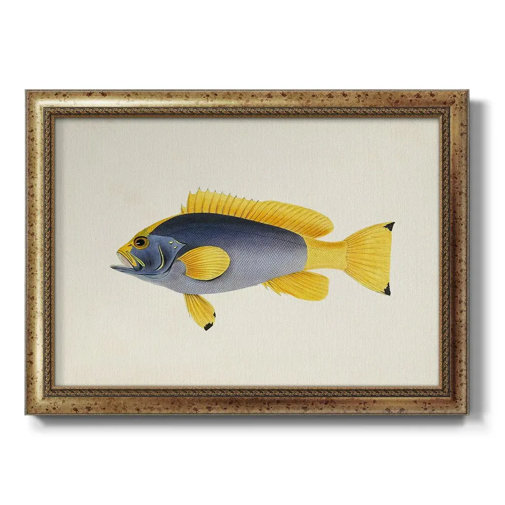 Tropical Fish Collection V Premium Framed Canvas- Ready to Hang A Premium Framed Canvas created to last. Framed in distressed wood and available in an array of sizes and colors Featuring a beveled a solid wood stretcher bar, each piece comes ready to hand 3 SIZES AVAILABLE 16''X20'' - Overall Size 18'X27'' - Overall Size 24''x36'' - Overall Size Each piece is made to order. Each piece comes with hanging hardware. Made in the USA Ready to Hang Giclee Paper Print Acrylic Glass Beveled Matt Board
