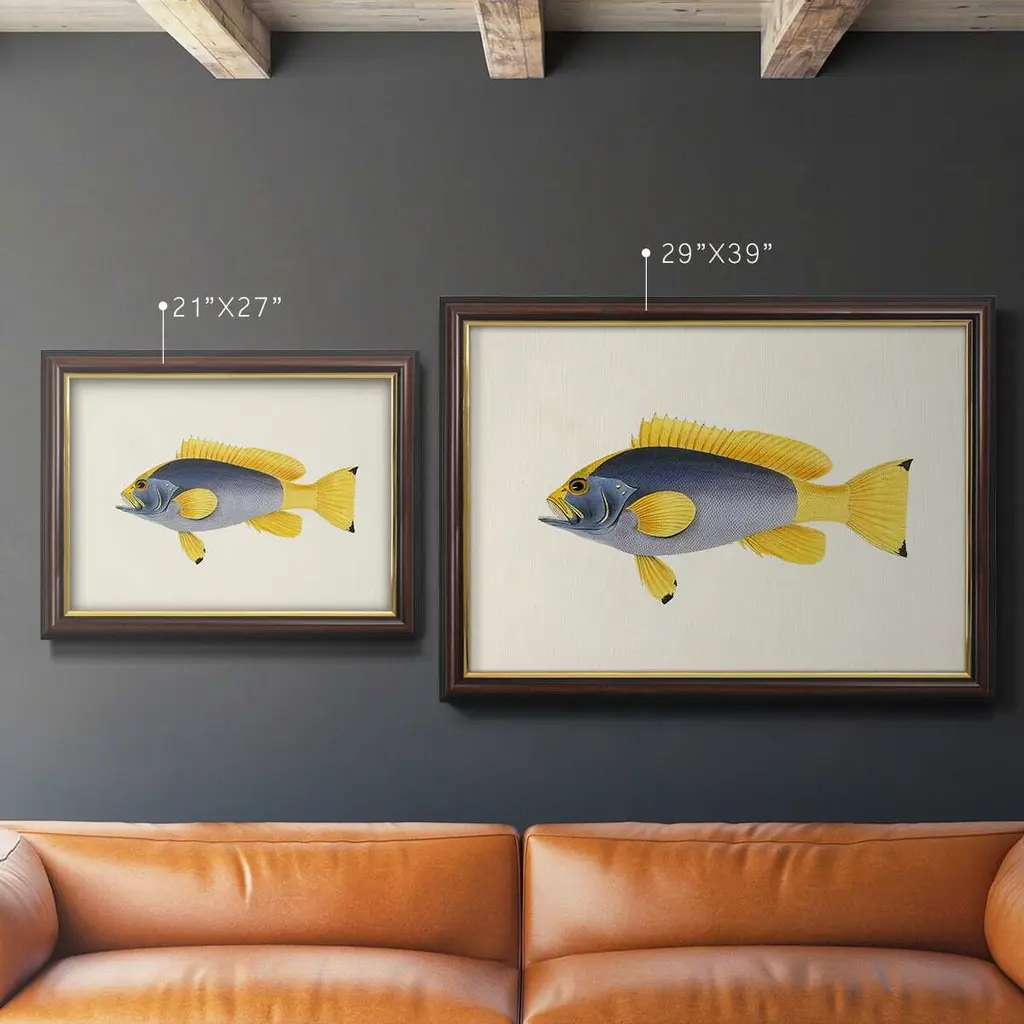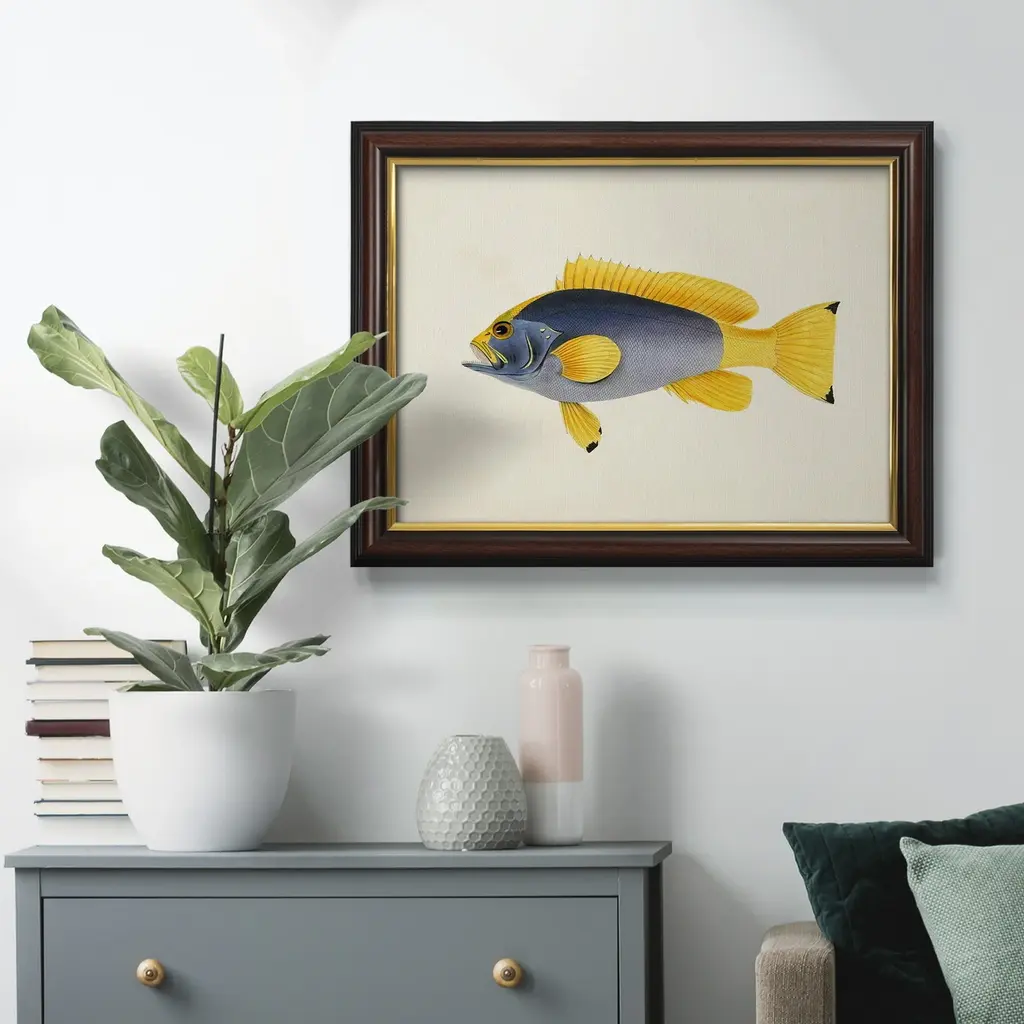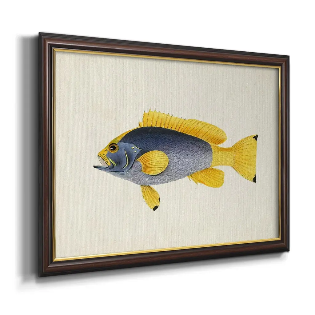 Tropical Fish Collection V Premium Framed Canvas- Ready to Hang A Premium Framed Canvas created to last. Framed in distressed wood and available in an array of sizes and colors Featuring a beveled a solid wood stretcher bar, each piece comes ready to hand 3 SIZES AVAILABLE 16''X20'' - Overall Size 18'X27'' - Overall Size 24''x36'' - Overall Size Each piece is made to order. Each piece comes with hanging hardware. Made in the USA Ready to Hang Giclee Paper Print Acrylic Glass Beveled Matt Board
