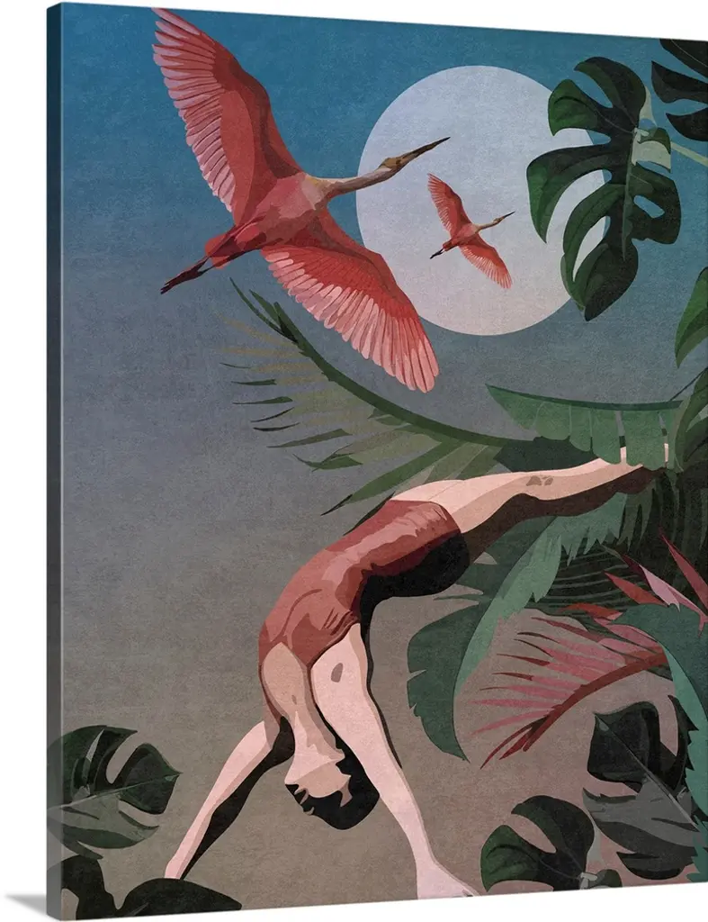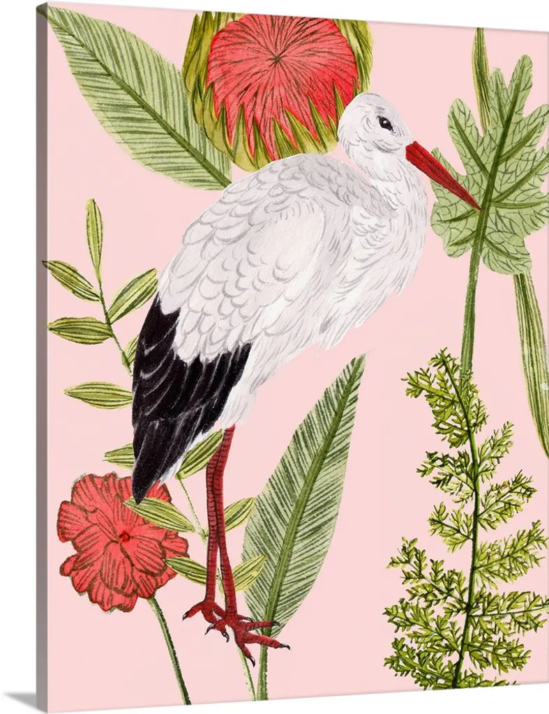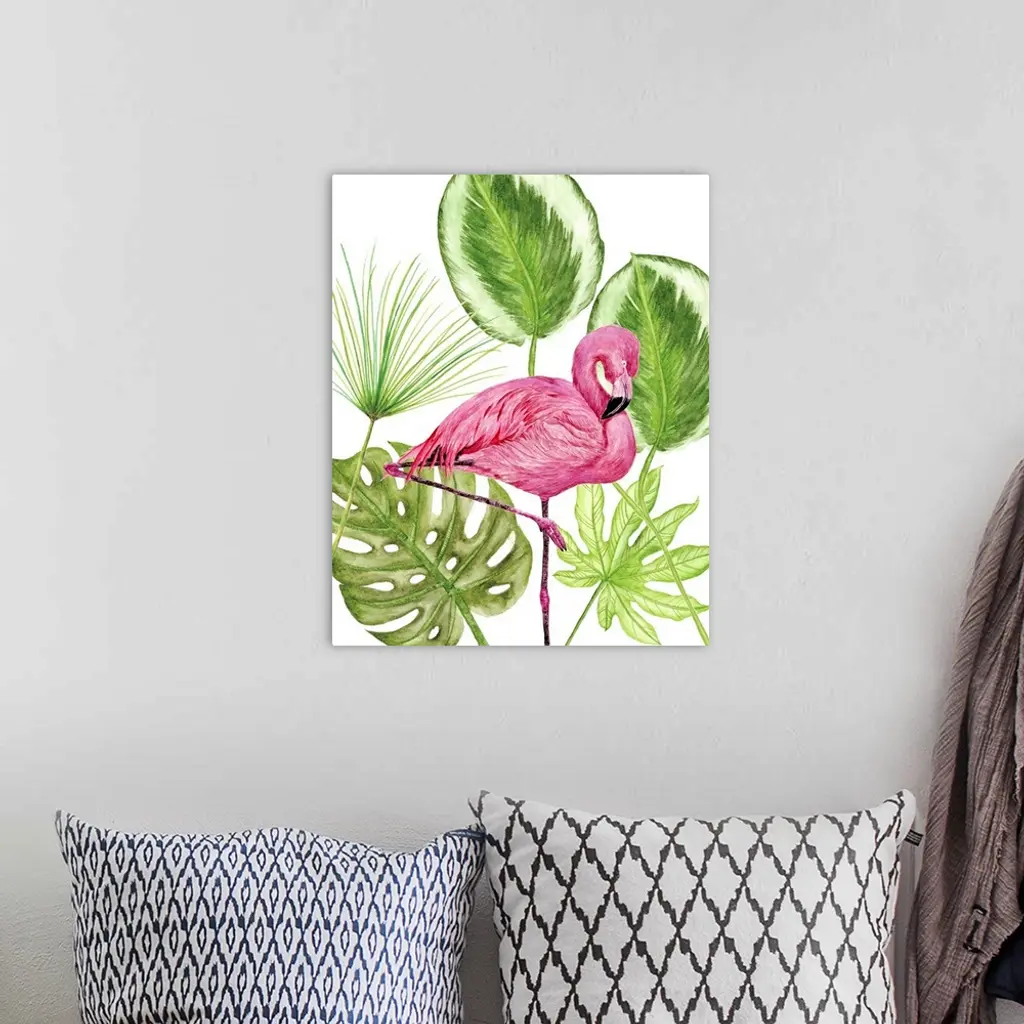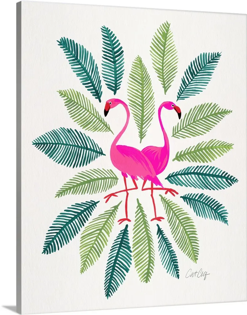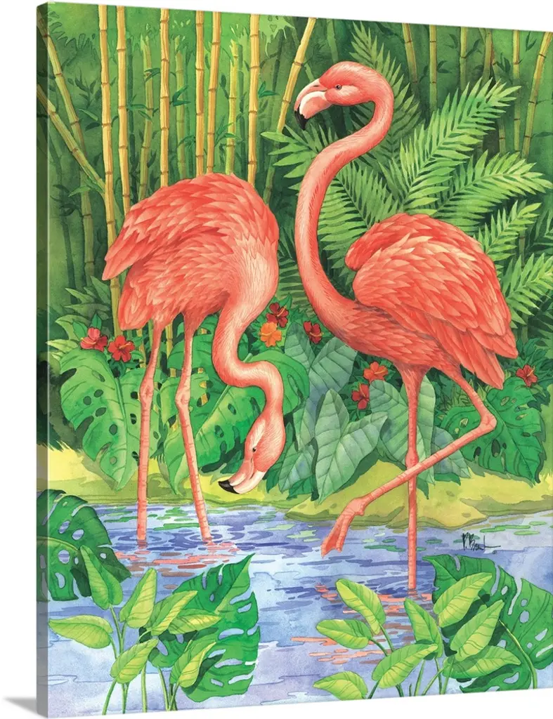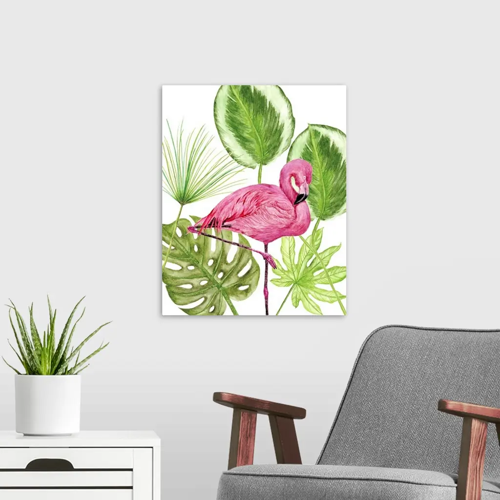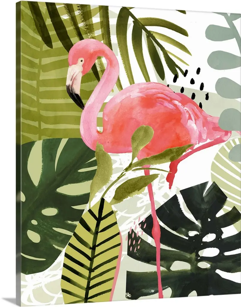 Artwork of a brightly colored flamingo against tropical green leaves.
