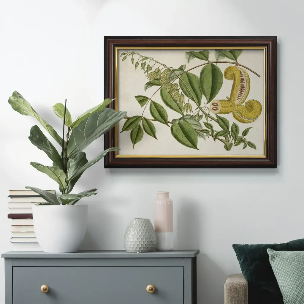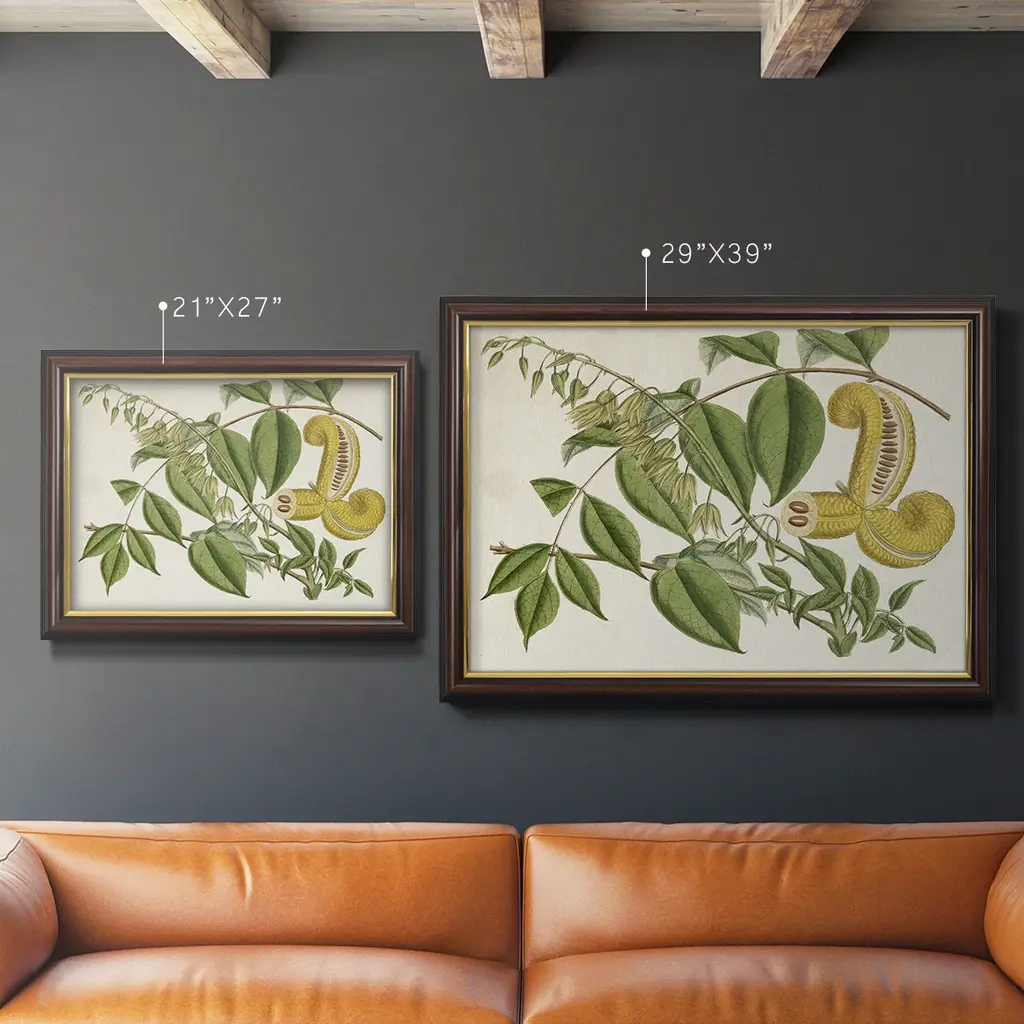 Tropical Foliage & Fruit I Premium Framed Canvas- Ready to Hang A Premium Framed Canvas created to last. Framed in distressed wood and available in an array of sizes and colors Featuring a beveled a solid wood stretcher bar, each piece comes ready to hand 3 SIZES AVAILABLE 16''X20'' - Overall Size 18'X27'' - Overall Size 24''x36'' - Overall Size Each piece is made to order. Each piece comes with hanging hardware. Made in the USA Ready to Hang Giclee Paper Print Acrylic Glass Beveled Matt Board