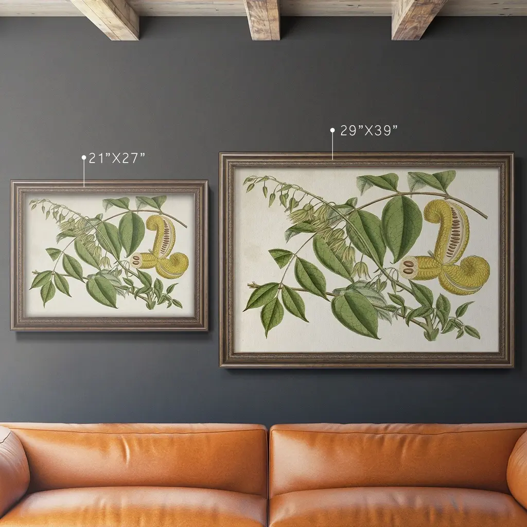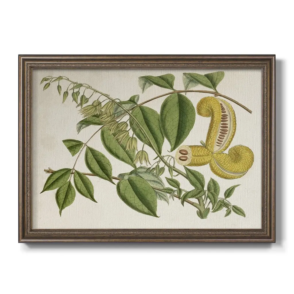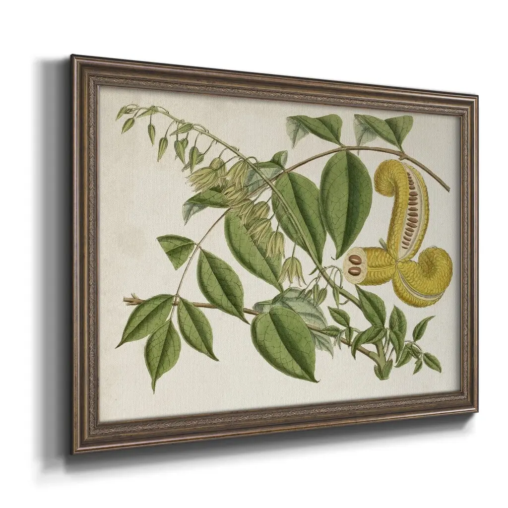 Tropical Foliage & Fruit I Premium Framed Canvas- Ready to Hang A Premium Framed Canvas created to last. Framed in distressed wood and available in an array of sizes and colors Featuring a beveled a solid wood stretcher bar, each piece comes ready to hand 3 SIZES AVAILABLE 16''X20'' - Overall Size 18'X27'' - Overall Size 24''x36'' - Overall Size Each piece is made to order. Each piece comes with hanging hardware. Made in the USA Ready to Hang Giclee Paper Print Acrylic Glass Beveled Matt Board