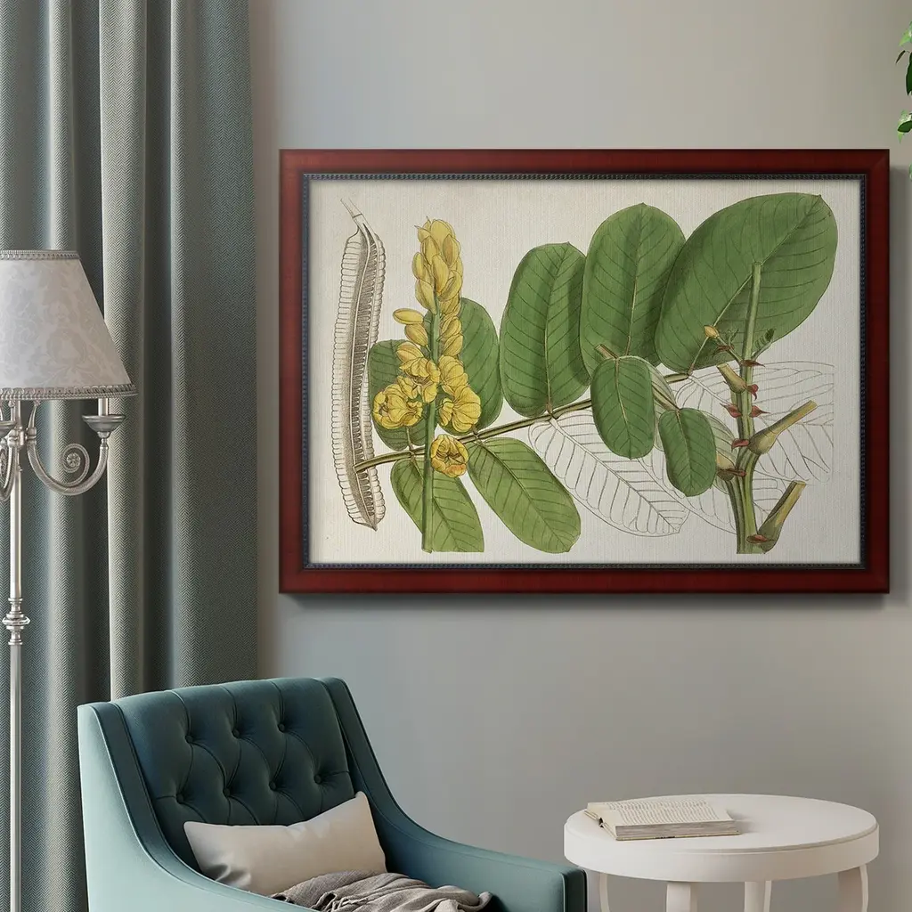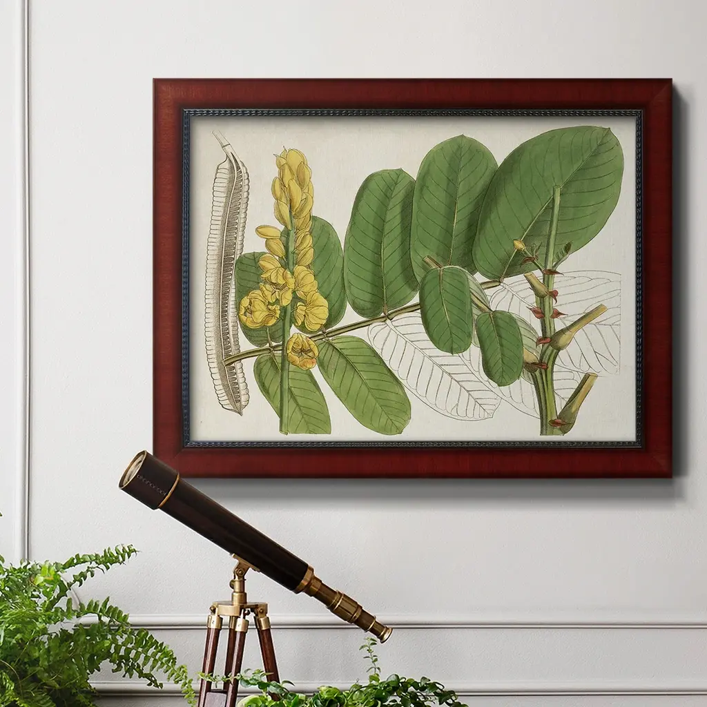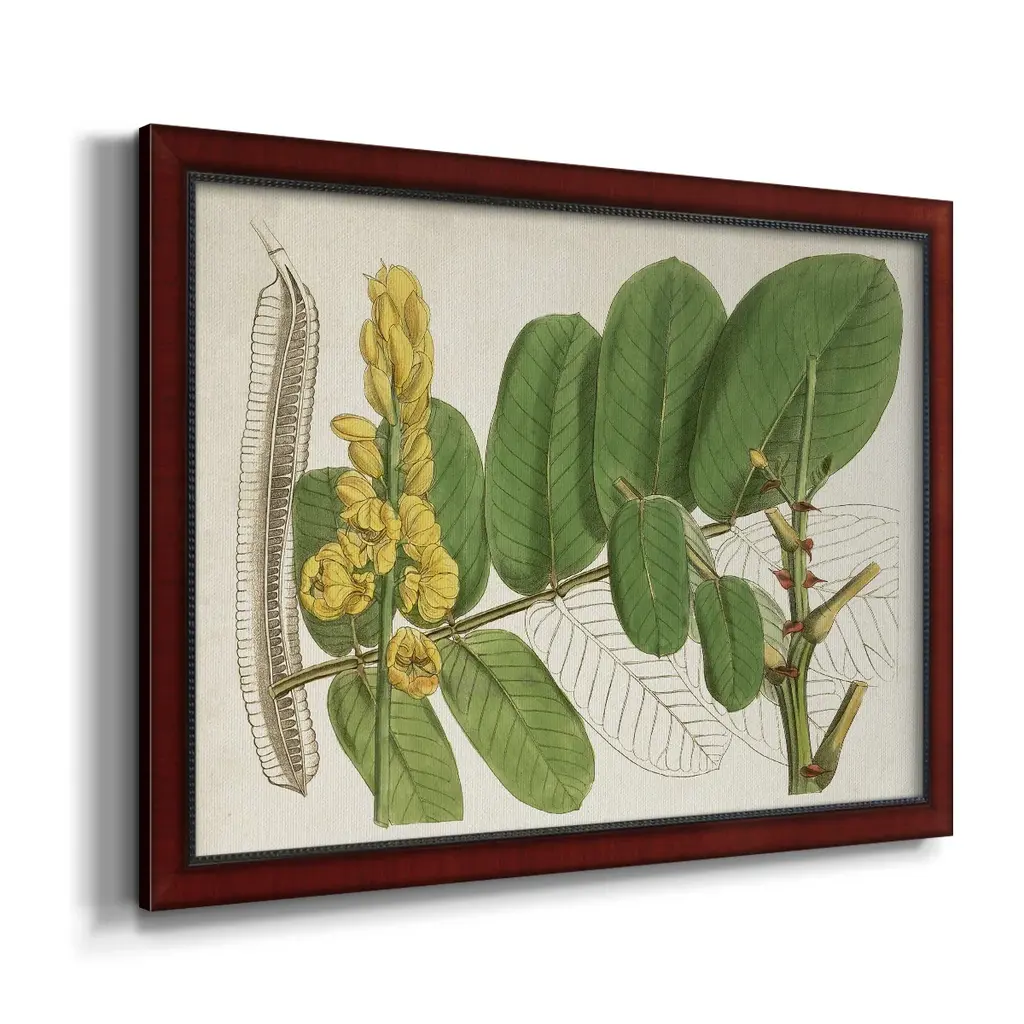 Tropical Foliage & Fruit II Premium Framed Canvas- Ready to Hang A Premium Framed Canvas created to last. Framed in distressed wood and available in an array of sizes and colors Featuring a beveled a solid wood stretcher bar, each piece comes ready to hand 3 SIZES AVAILABLE 16''X20'' - Overall Size 18'X27'' - Overall Size 24''x36'' - Overall Size Each piece is made to order. Each piece comes with hanging hardware. Made in the USA Ready to Hang Giclee Paper Print Acrylic Glass Beveled Matt Board