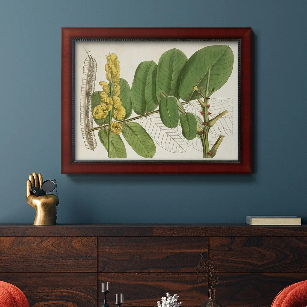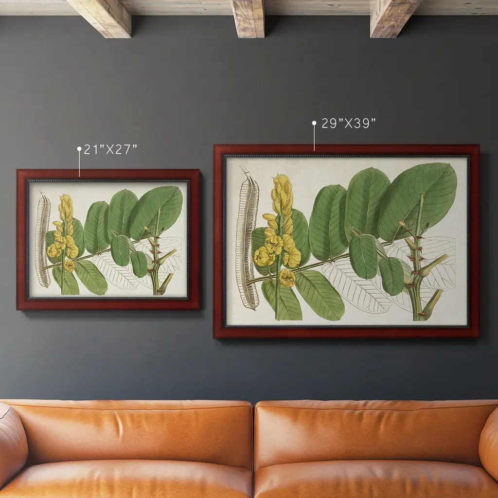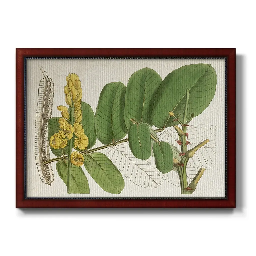 Tropical Foliage & Fruit II Premium Framed Canvas- Ready to Hang A Premium Framed Canvas created to last. Framed in distressed wood and available in an array of sizes and colors Featuring a beveled a solid wood stretcher bar, each piece comes ready to hand 3 SIZES AVAILABLE 16''X20'' - Overall Size 18'X27'' - Overall Size 24''x36'' - Overall Size Each piece is made to order. Each piece comes with hanging hardware. Made in the USA Ready to Hang Giclee Paper Print Acrylic Glass Beveled Matt Board