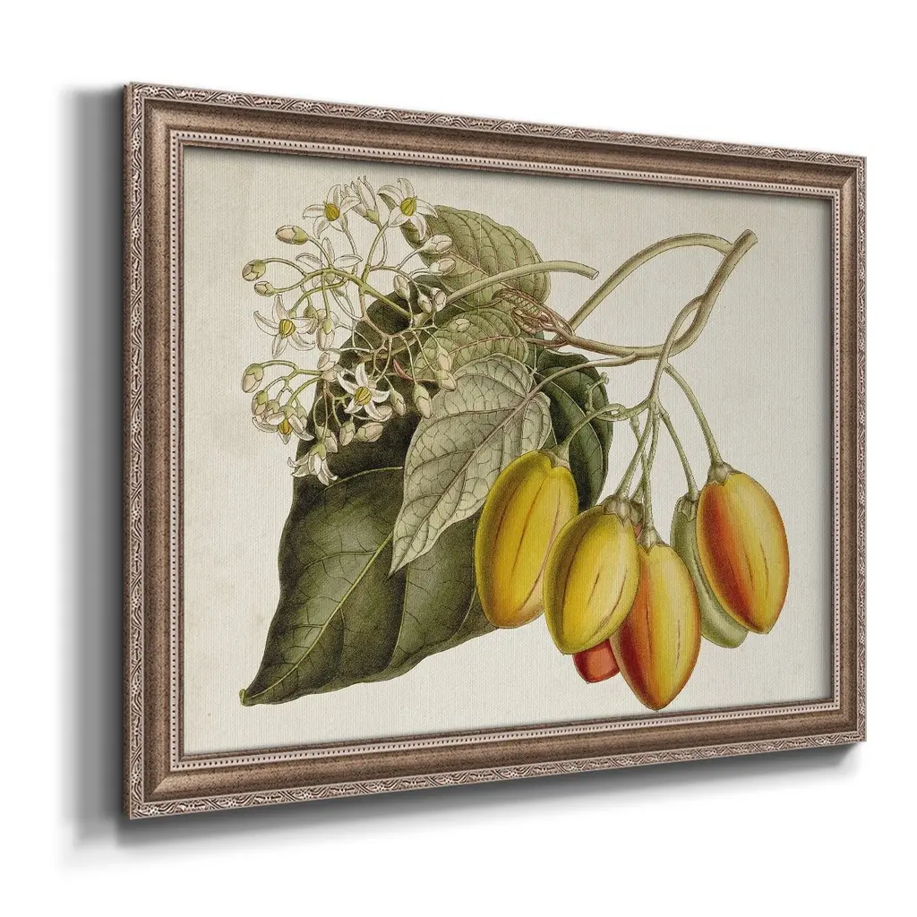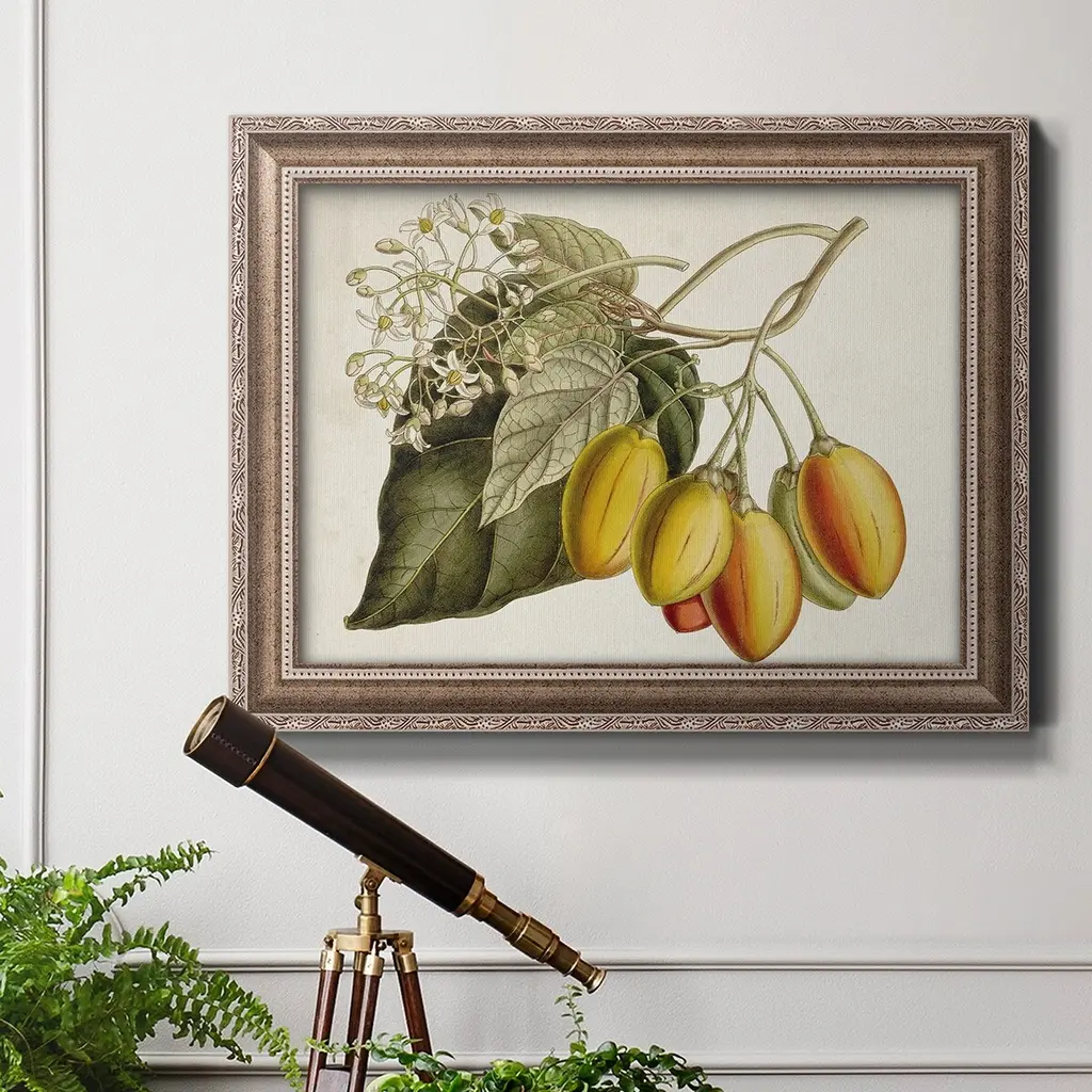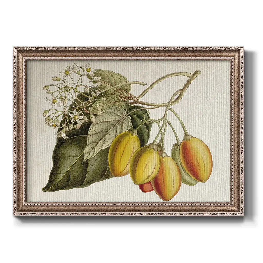 Tropical Foliage & Fruit IV Premium Framed Canvas- Ready to Hang A Premium Framed Canvas created to last. Framed in distressed wood and available in an array of sizes and colors Featuring a beveled a solid wood stretcher bar, each piece comes ready to hand 3 SIZES AVAILABLE 16''X20'' - Overall Size 18'X27'' - Overall Size 24''x36'' - Overall Size Each piece is made to order. Each piece comes with hanging hardware. Made in the USA Ready to Hang Giclee Paper Print Acrylic Glass Beveled Matt Board