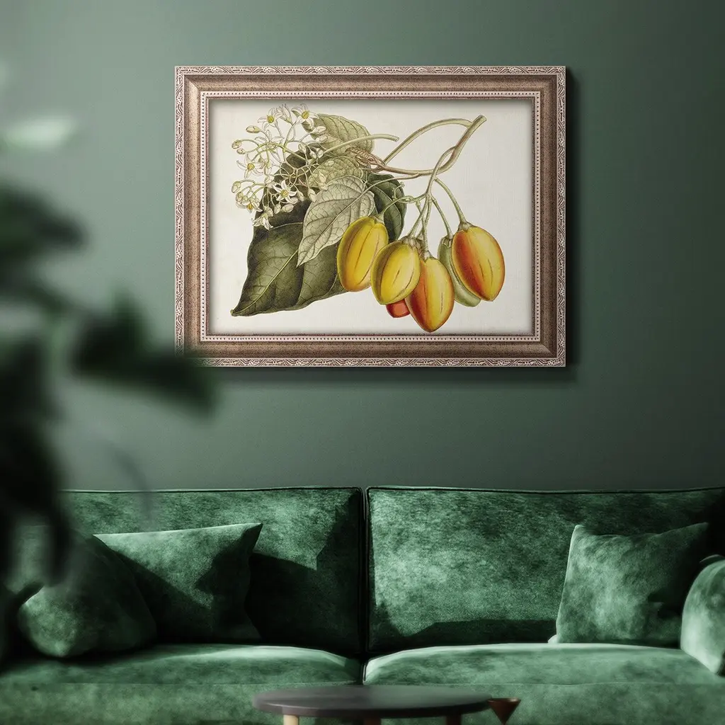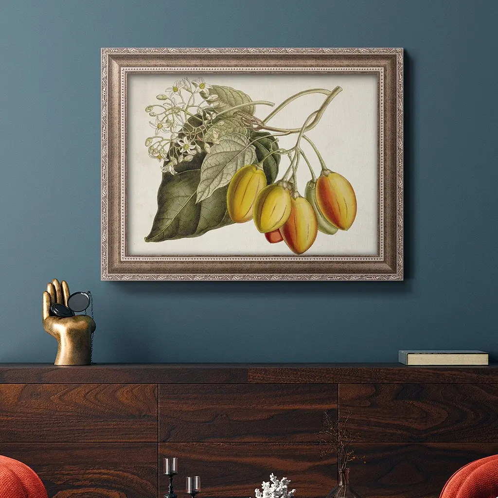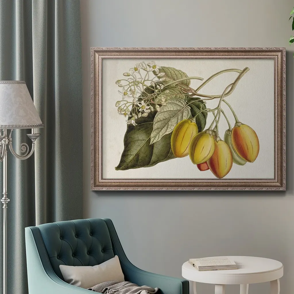 Tropical Foliage & Fruit IV Premium Framed Canvas- Ready to Hang A Premium Framed Canvas created to last. Framed in distressed wood and available in an array of sizes and colors Featuring a beveled a solid wood stretcher bar, each piece comes ready to hand 3 SIZES AVAILABLE 16''X20'' - Overall Size 18'X27'' - Overall Size 24''x36'' - Overall Size Each piece is made to order. Each piece comes with hanging hardware. Made in the USA Ready to Hang Giclee Paper Print Acrylic Glass Beveled Matt Board