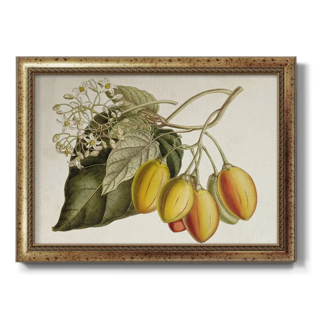 Tropical Foliage & Fruit IV Premium Framed Canvas- Ready to Hang A Premium Framed Canvas created to last. Framed in distressed wood and available in an array of sizes and colors Featuring a beveled a solid wood stretcher bar, each piece comes ready to hand 3 SIZES AVAILABLE 16''X20'' - Overall Size 18'X27'' - Overall Size 24''x36'' - Overall Size Each piece is made to order. Each piece comes with hanging hardware. Made in the USA Ready to Hang Giclee Paper Print Acrylic Glass Beveled Matt Board