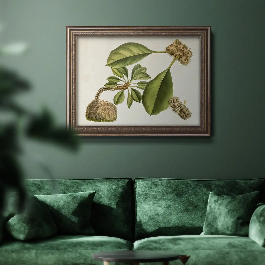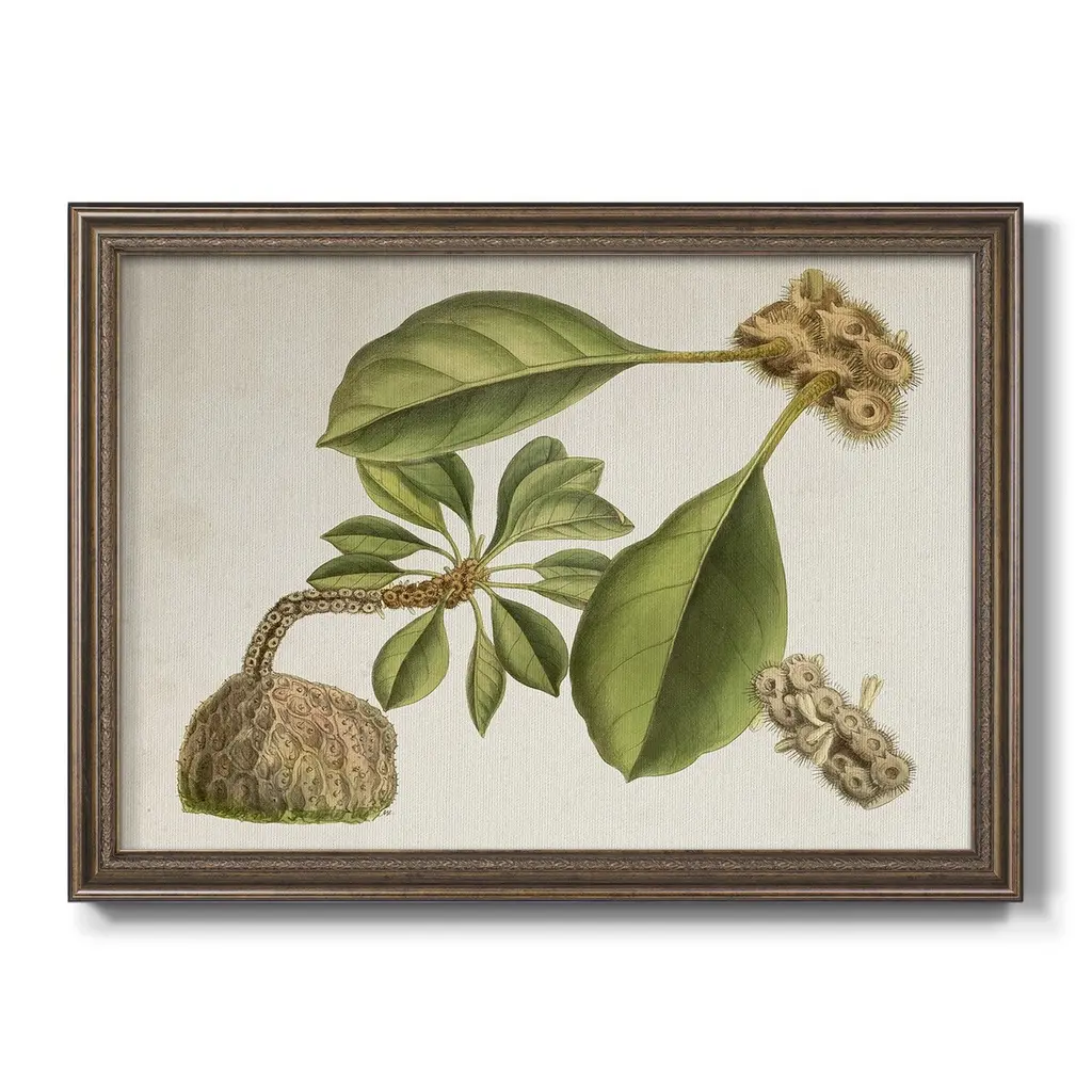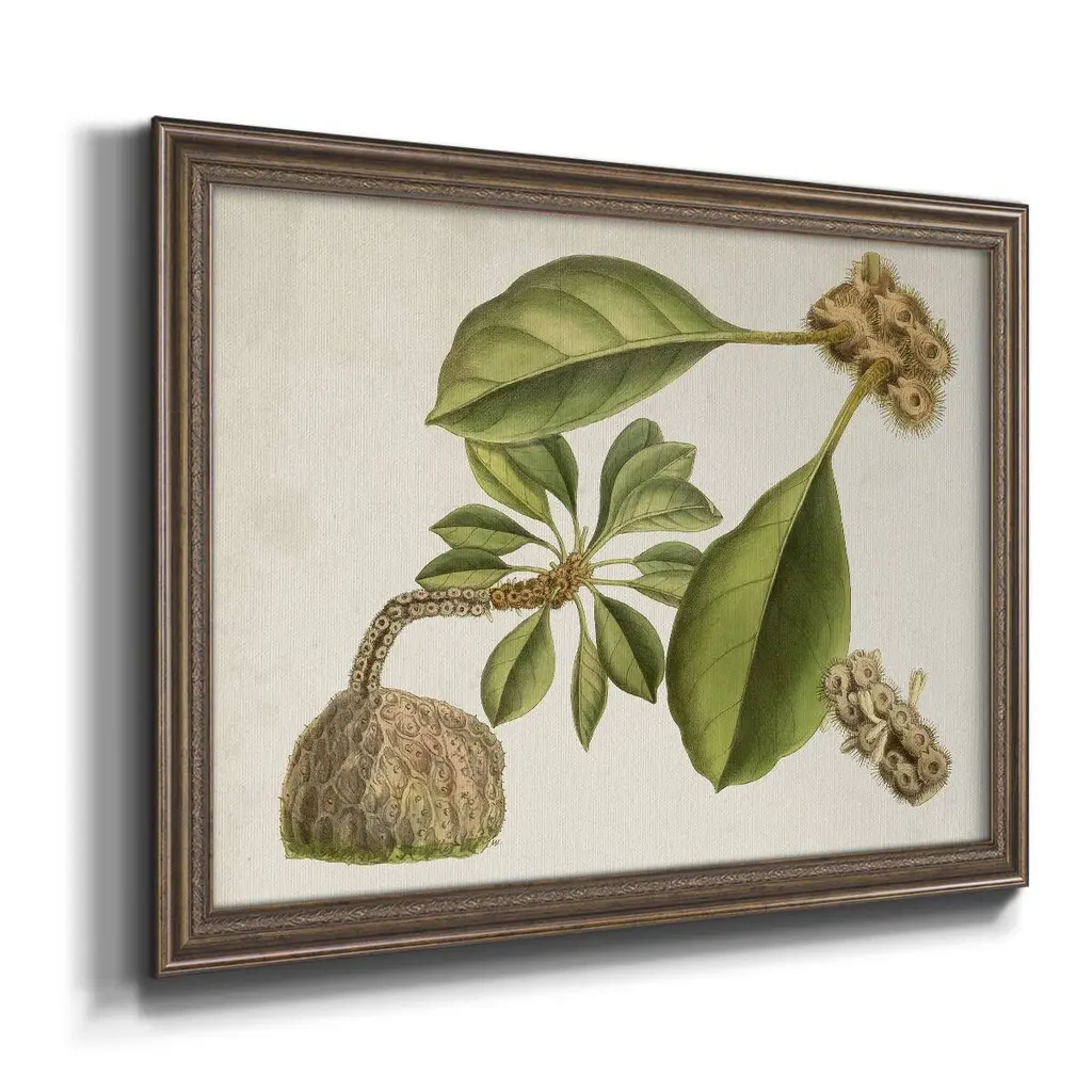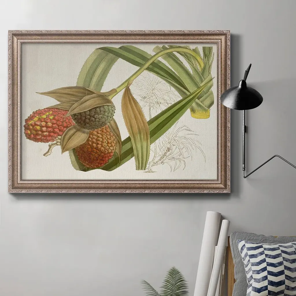 Tropical Foliage & Fruit V Premium Framed Canvas- Ready to Hang A Premium Framed Canvas created to last. Framed in distressed wood and available in an array of sizes and colors Featuring a beveled a solid wood stretcher bar, each piece comes ready to hand 3 SIZES AVAILABLE 16''X20'' - Overall Size 18'X27'' - Overall Size 24''x36'' - Overall Size Each piece is made to order. Each piece comes with hanging hardware. Made in the USA Ready to Hang Giclee Paper Print Acrylic Glass Beveled Matt Board