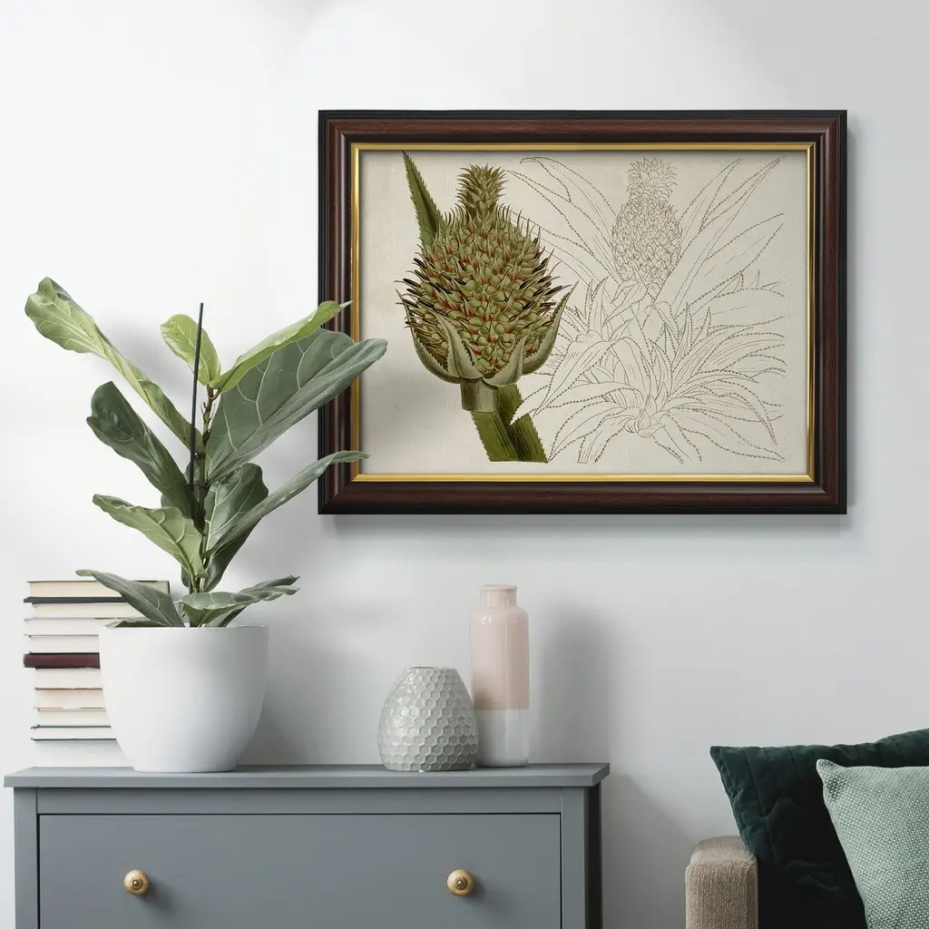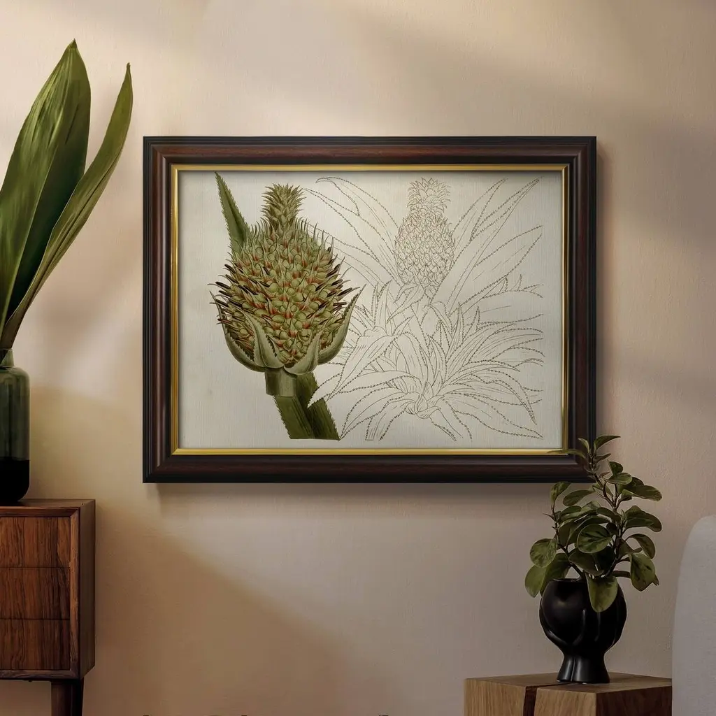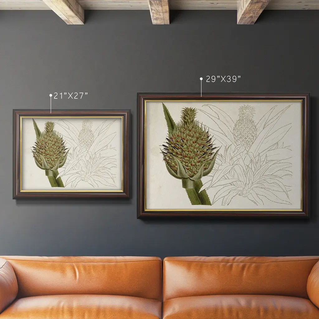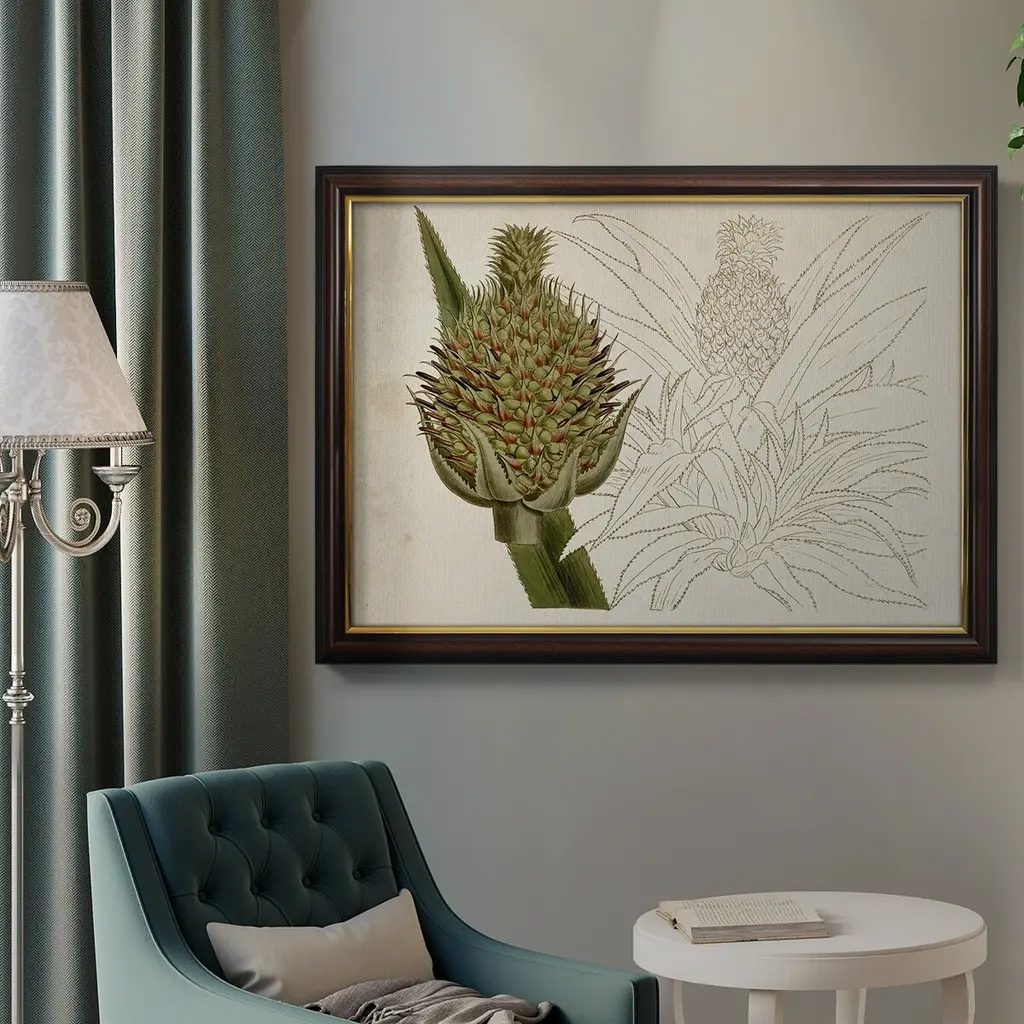 Tropical Foliage & Fruit VI Premium Framed Canvas- Ready to Hang A Premium Framed Canvas created to last. Framed in distressed wood and available in an array of sizes and colors Featuring a beveled a solid wood stretcher bar, each piece comes ready to hand 3 SIZES AVAILABLE 16''X20'' - Overall Size 18'X27'' - Overall Size 24''x36'' - Overall Size Each piece is made to order. Each piece comes with hanging hardware. Made in the USA Ready to Hang Giclee Paper Print Acrylic Glass Beveled Matt Board