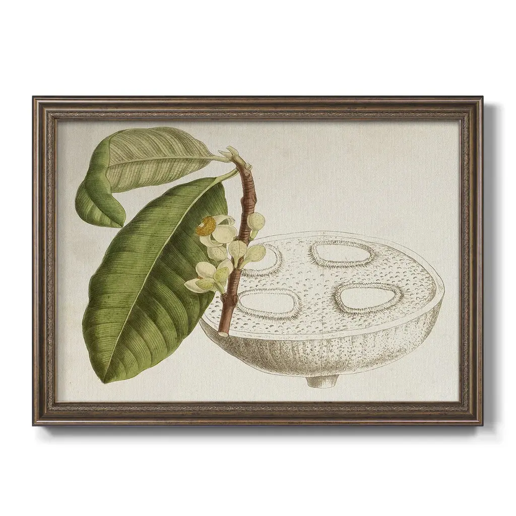 Tropical Foliage & Fruit VII Premium Framed Canvas- Ready to Hang A Premium Framed Canvas created to last. Framed in distressed wood and available in an array of sizes and colors Featuring a beveled a solid wood stretcher bar, each piece comes ready to hand 3 SIZES AVAILABLE 16''X20'' - Overall Size 18'X27'' - Overall Size 24''x36'' - Overall Size Each piece is made to order. Each piece comes with hanging hardware. Made in the USA Ready to Hang Giclee Paper Print Acrylic Glass Beveled Matt Board