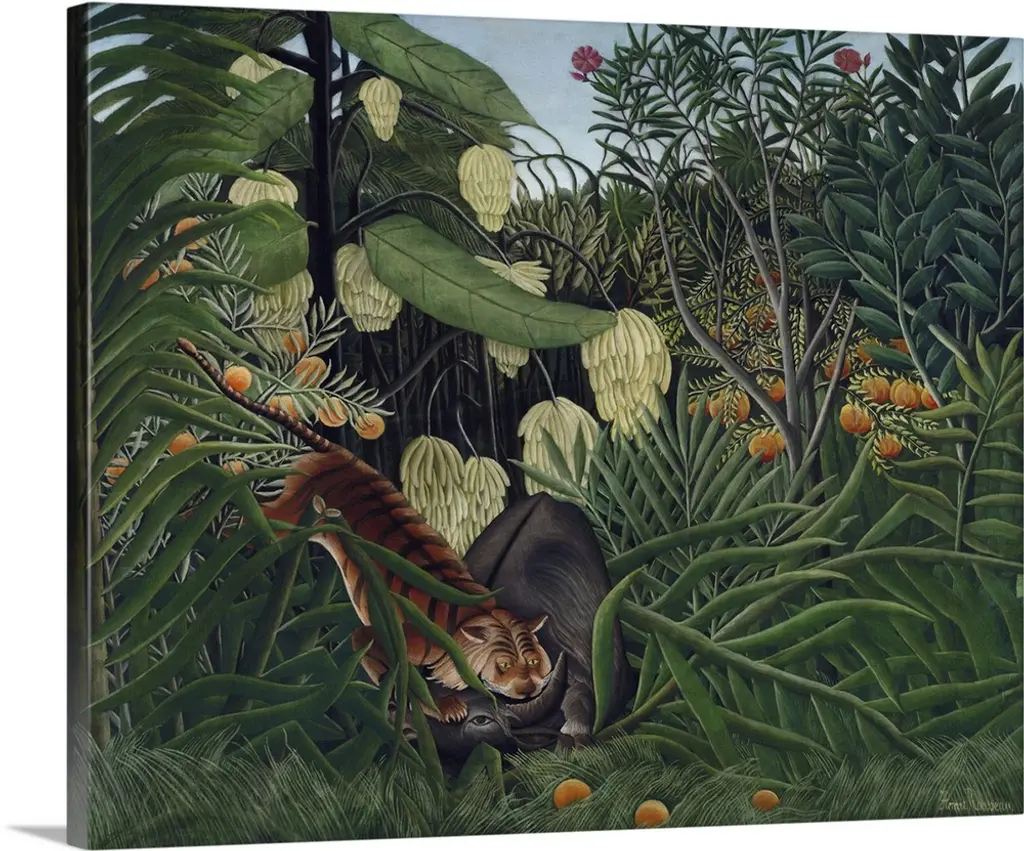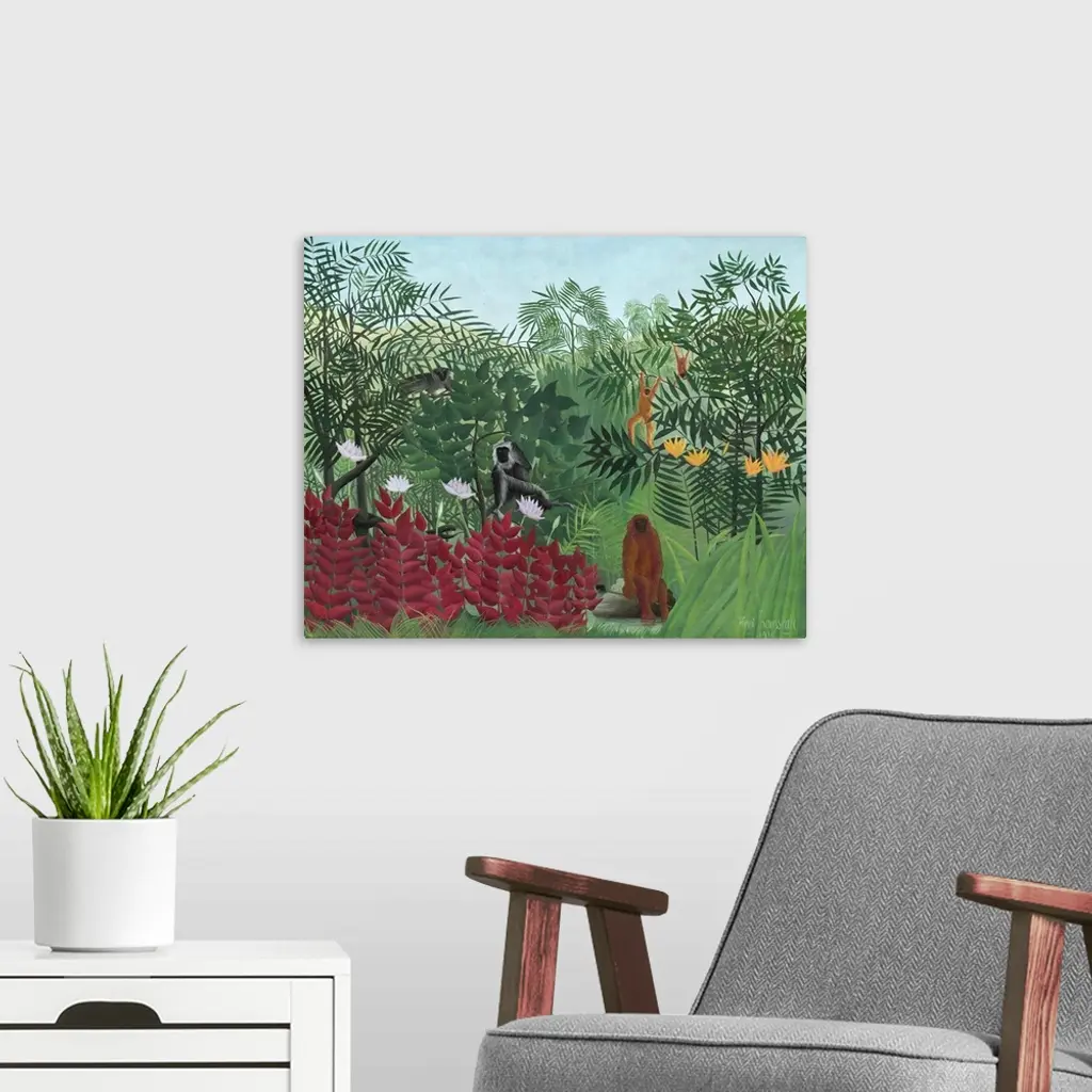 Tropical Forest with Monkeys, by Henri Rousseau, 1910, French painting, oil on canvas. Rousseau exaggerated the size of common plants and flowers, creating a lush environment for the creatures in his fantasy landscapes