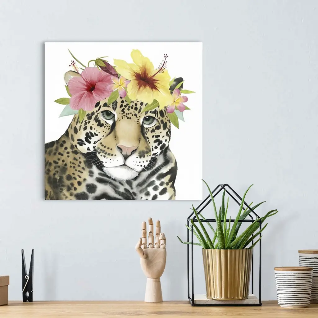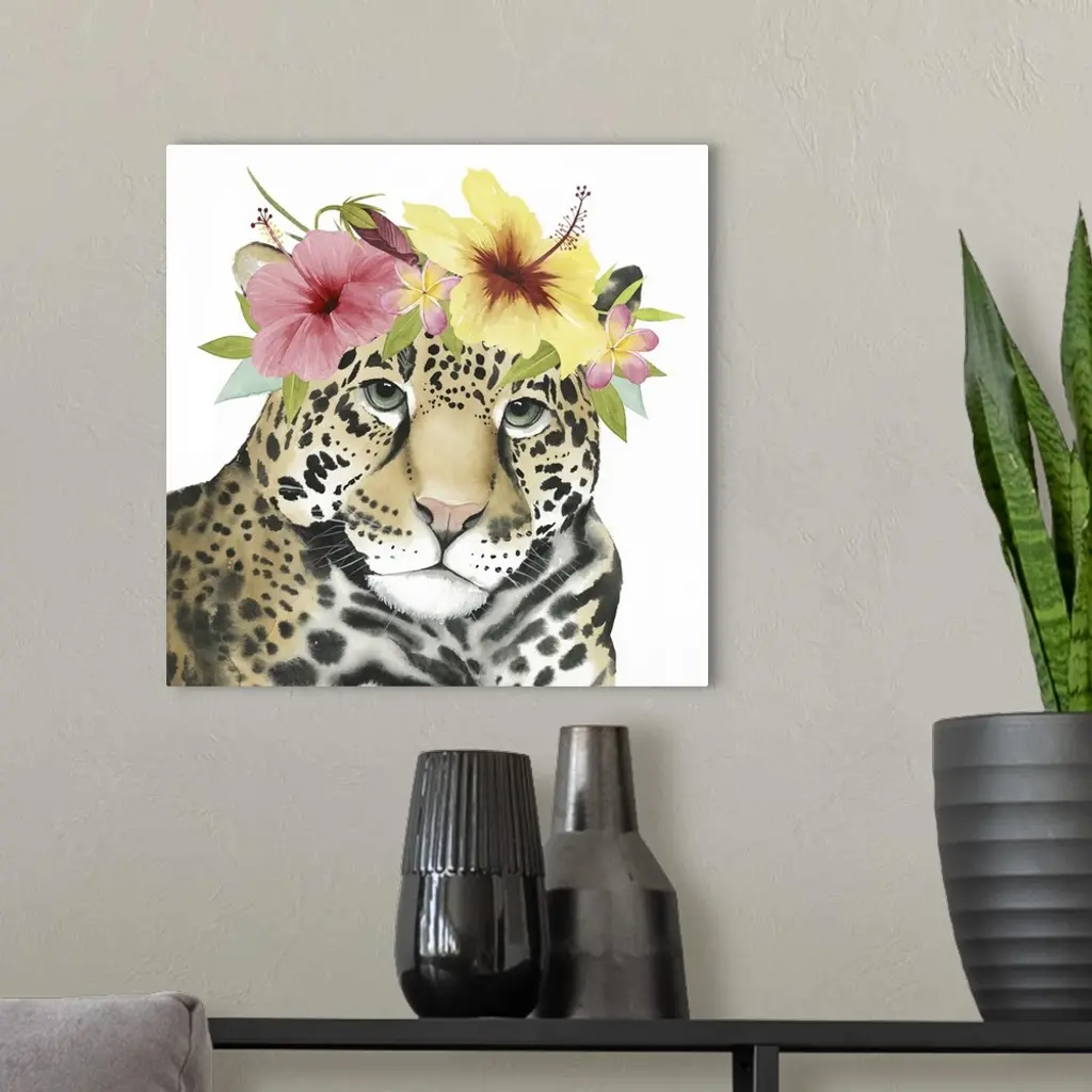 This decorative artwork features an adorable leopard over a white background with a tropical flower crown on its head.