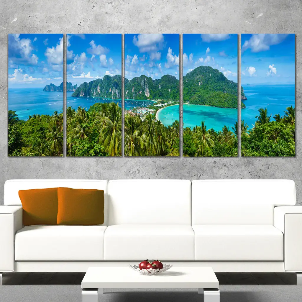 The Tropical Island Panorama canvas art print is sure to make an impression on anyone who sees it. This artwork is gallery wrapped around a 1-inch solid wood frame and arrives carefully packaged and entirely ready to hang on the wall. Design Art only uses the highest resolution and pigments to ensure a crisp colorful print that is never faded or pixelated. This artwork is sure to be a conversation starter in any home or office.
