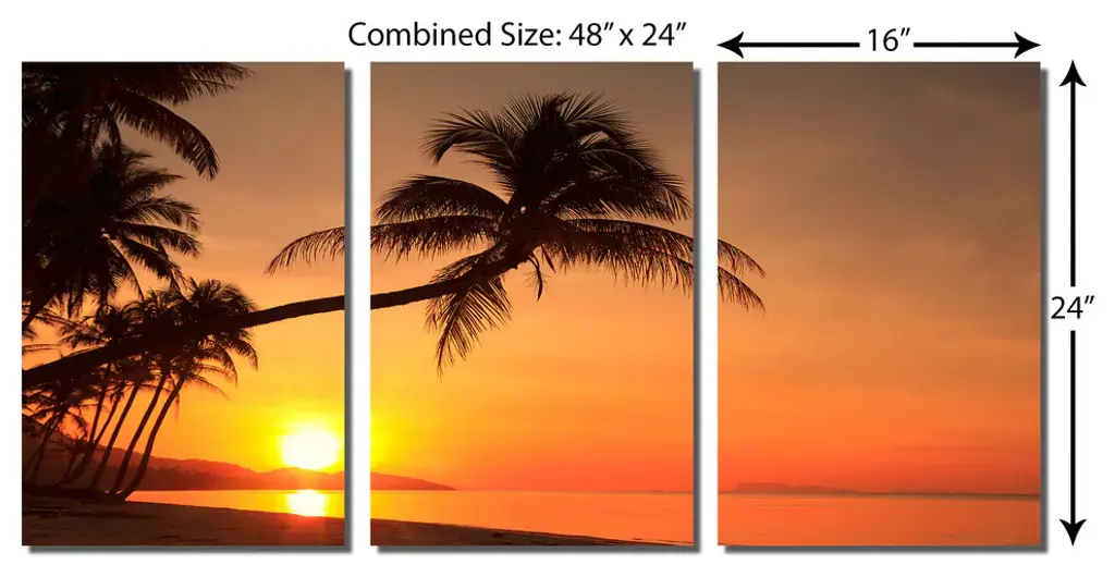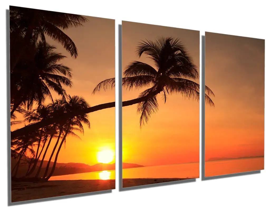 48"œ x 24"œ total size. Ready To Hang! (3 pieces - 16"œ x 24"œ each). 3 Panel Split (Triptych) Metal Print ft. Sunset on a tropical island behind a palm tree. Modern metal wall art for home or office wall decor & interior design. Printed on Luxurious, HD aluminum glossy metal panels. Multi panel art.. HD aluminum panels. Metal print wall art. Includes Shadow Wall Mount on the back.• Aluminum Metal Wall Art• Made in USA• Ready to hang - No assembly required• Shadow mount hardware on the back• 0.045"œ thick HD Aluminum Panels• Scratch resistant, glossy finish• Superb color clarity, luxurious prints• Epson printing process• For indoor or moisture rich environment use• Easy to clean. Gently wipe with microfiber cloth.