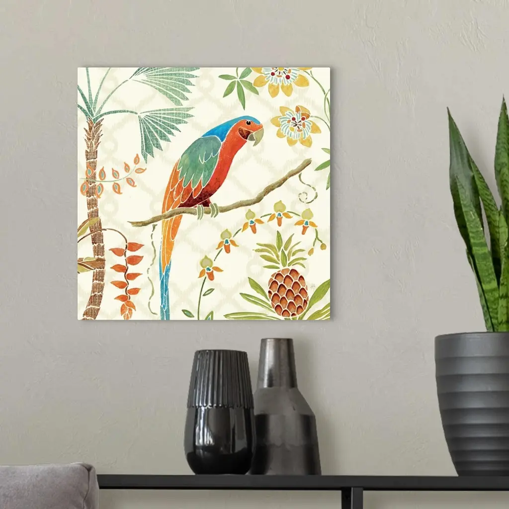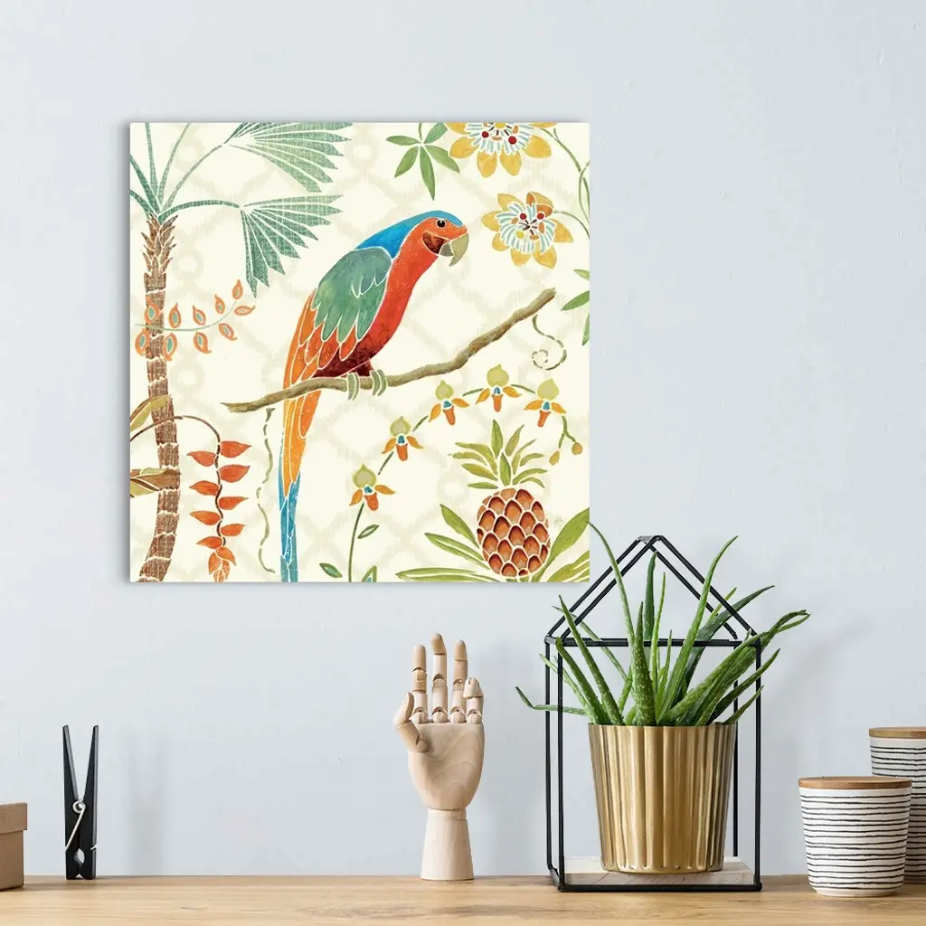 Contemporary painting of a brightly colored parrot perched on branch, surrounded by flowers.