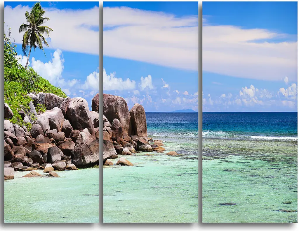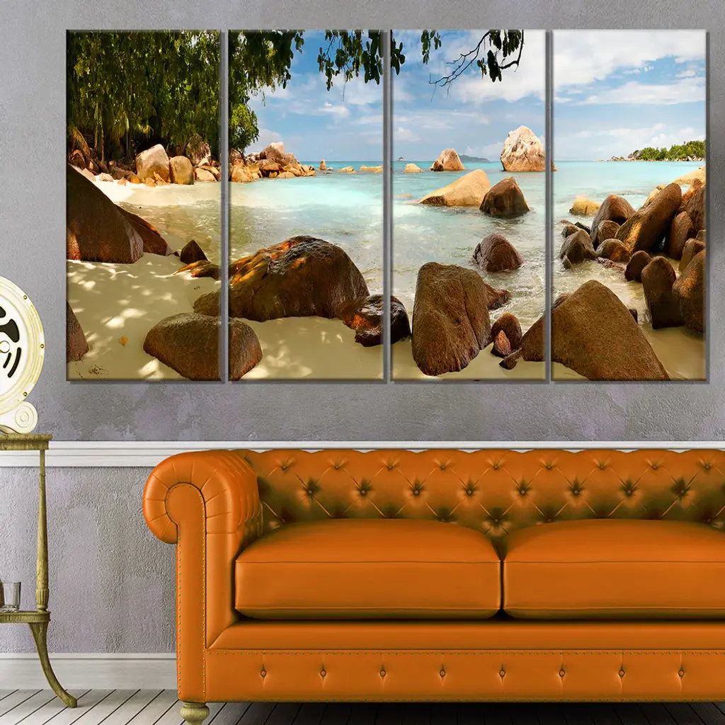"Tropical Rocky Beach Panorama" Wall Art Landscape, 4 Panels, 48"x28"