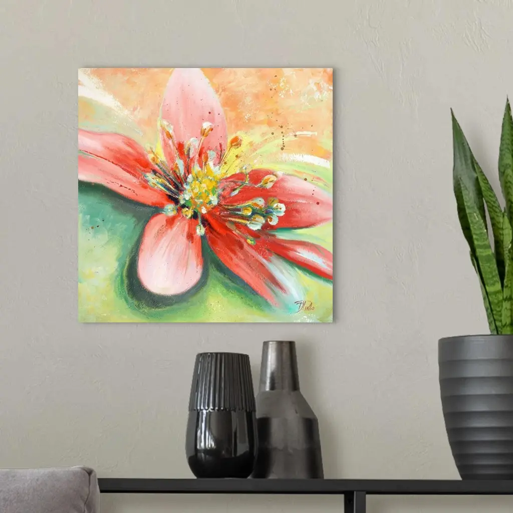 Contemporary painting of a vibrant red flower against a bright green and orange background.