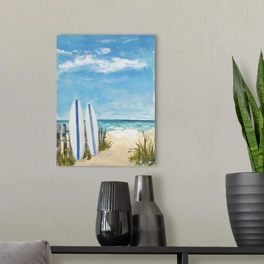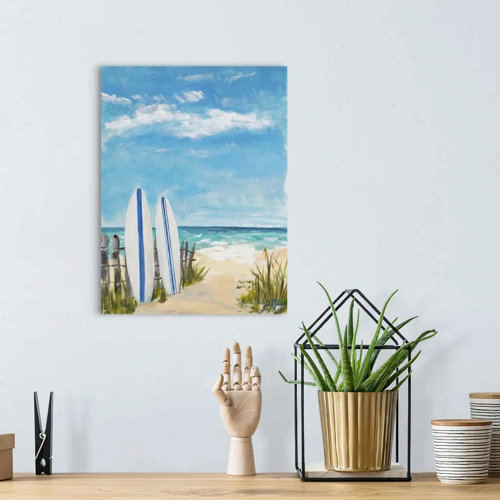 Contemporary painting of two surf boards standing up against a wooden fence on the beach.
