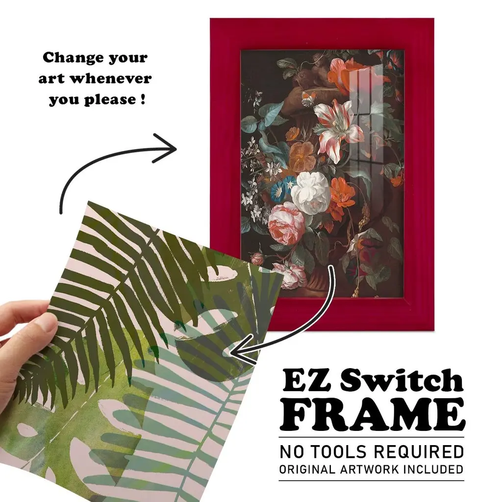 Tropical Tangle I -EZ SWITCH Framed Print w/glass-Cherry Red A delightful, framed print. Featuring a solid wood frame with real wood glass. This premium print is giclee quality. In addition, every frame features a removable back and table top stand. This allows you to change your art in the future or to just stand the art on a table for a new look. We are sure you'll enjoy our new series of EZ SWITCH Framed Art. Solid Wood Frame Real Glass Removable / Replaceable Art Built in Tabletop Stand Sizes range from 4x6 up to 12x15 - buy just one or pair them up as sets as you see fit.