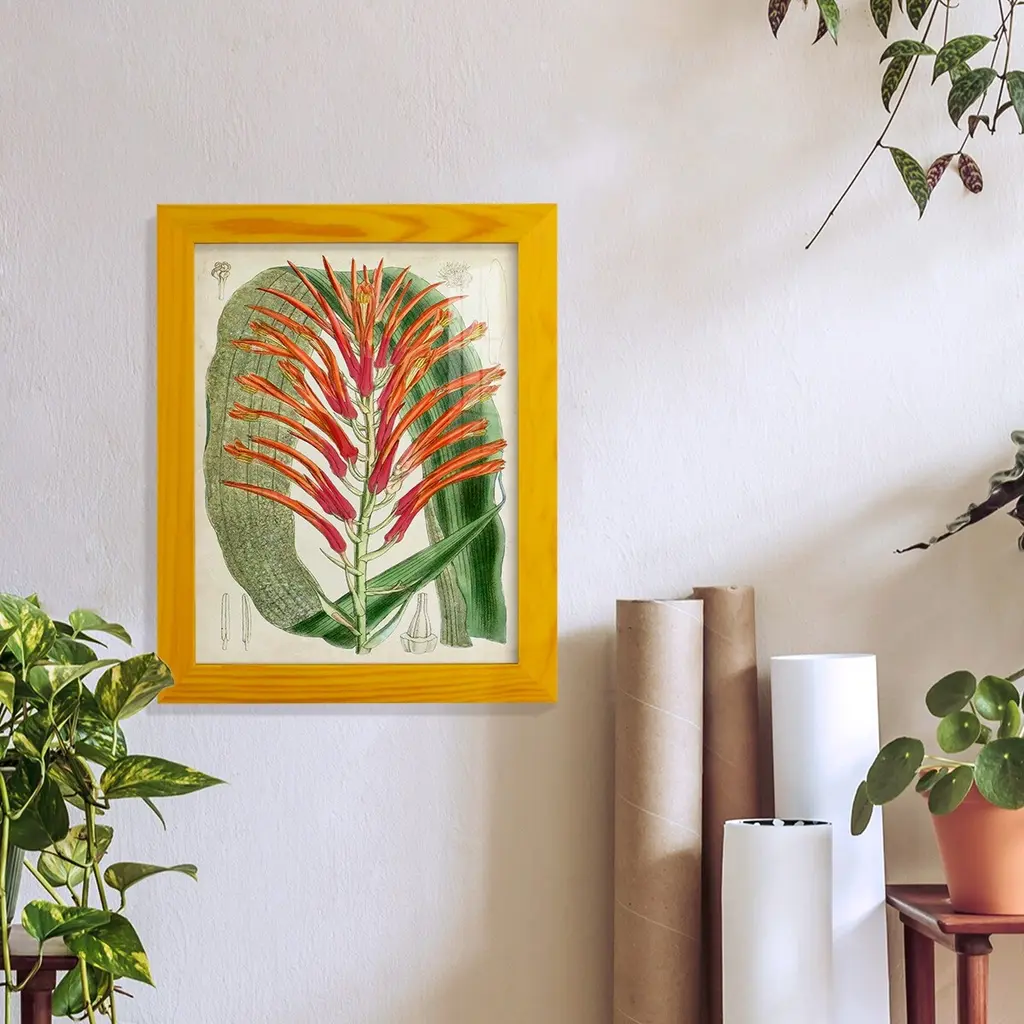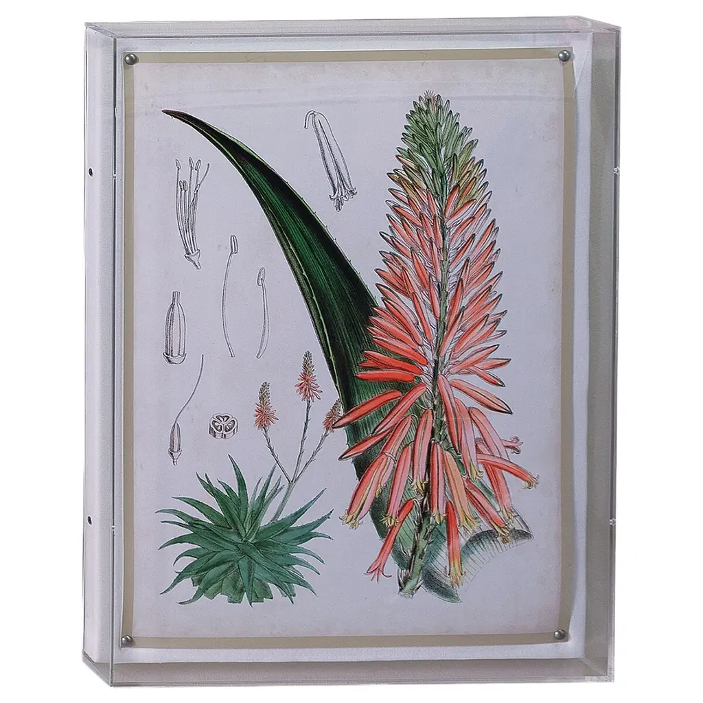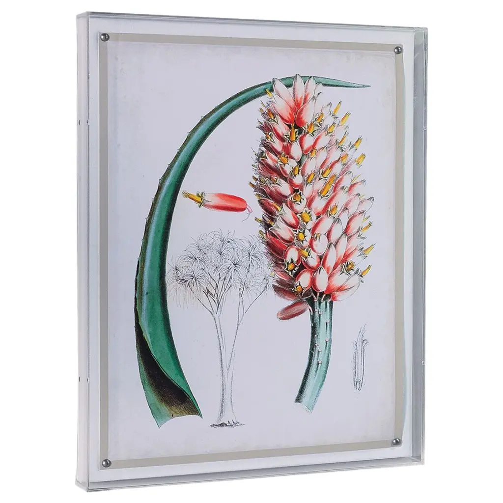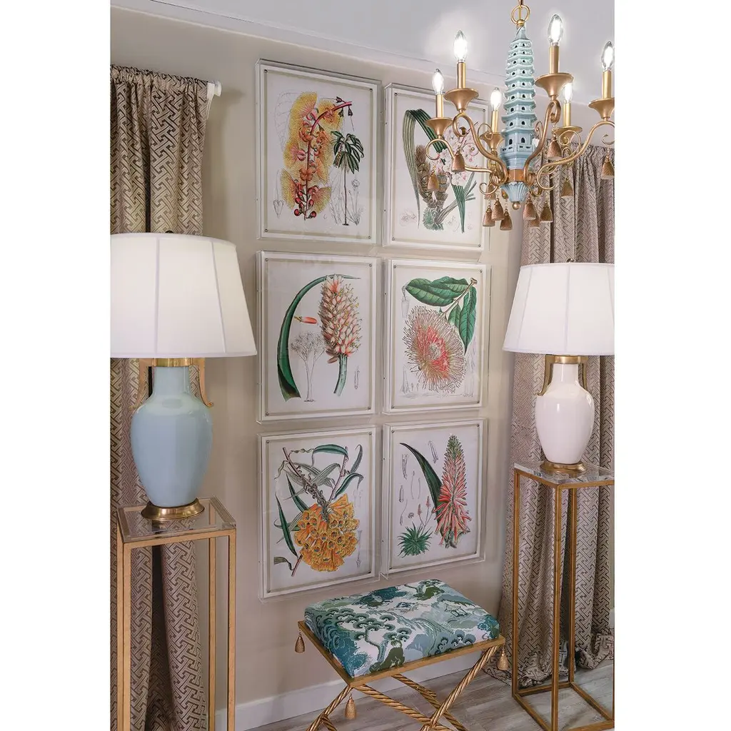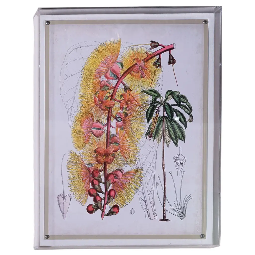 Our Tropicals artwork presents a delicate blend of pink and gold hues across a series of floral studies in six prints. Each piece features a giclee print mounted within a 2.5" deep lucite shadow box, attached to a linen-wrapped interior panel, and finished with nickel nail heads at each corner. These panels are available for individual purchase and can be displayed solo or as a complete set of six. Measurements: 26"H x 20"W x 2.5"D. Materials include an acrylic frame, interior board mount, and giclee paper print.