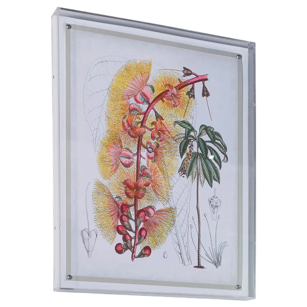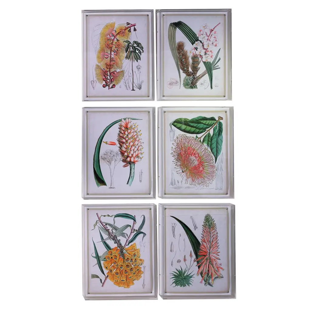 Our Tropicals artwork is a soft touch of pink and gold color over floral studies of 6 prints. The artwork features a giclee print mounted under a 2.5" deep lucite shadow box. Attached to a linen wrapped interior panel, the artwork is finished with nickel nail head in each corner. Each panel is sold individually. Artwork may be hung individually, or as a set of 6 with mates. Measurements: 26"H x 20"W x 2.5"D. Materials: acrylic frame, interior board mount, giclee paper print.