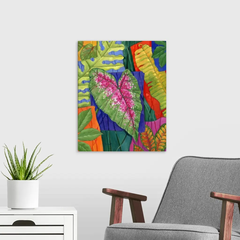 Colorful painting of multicolored tropical leaves of different sizes.