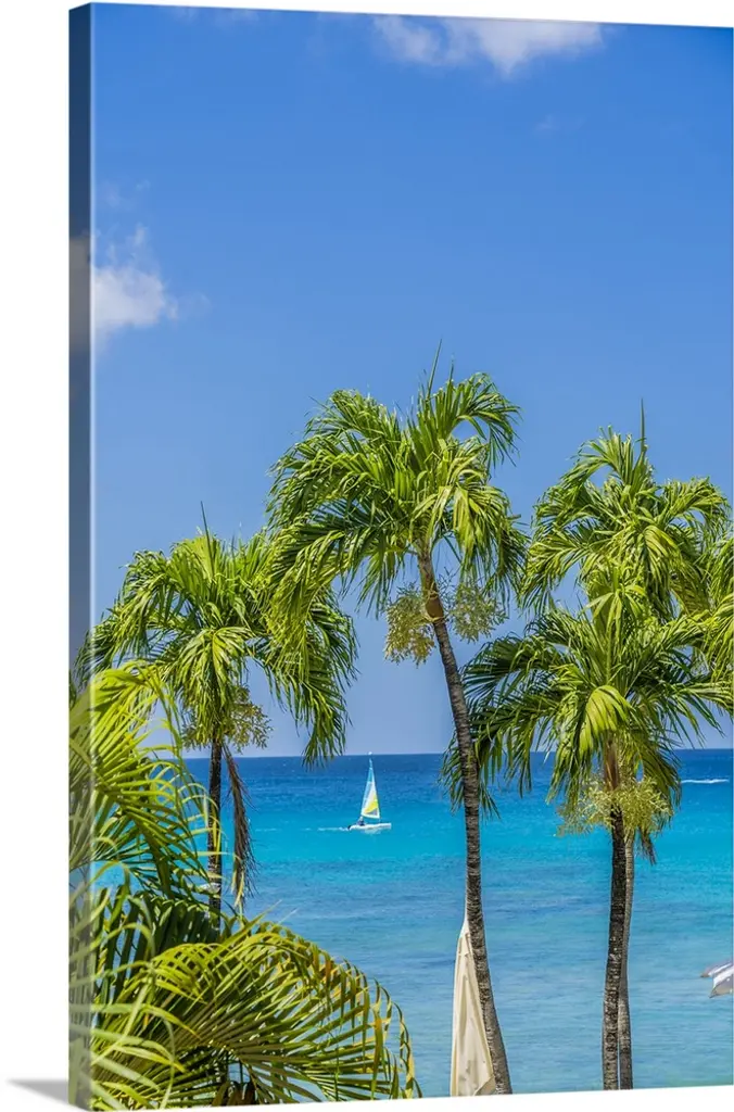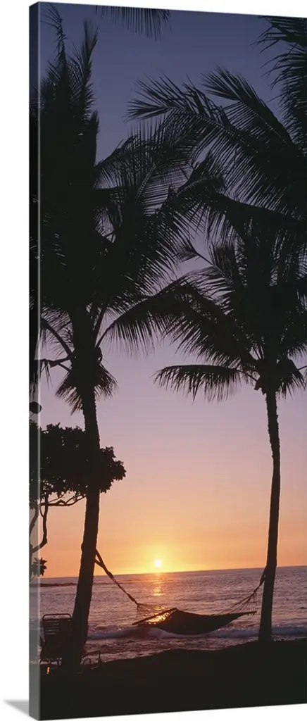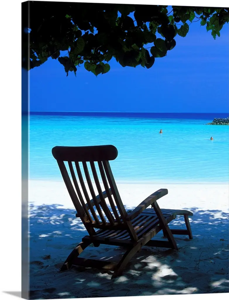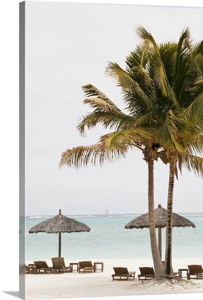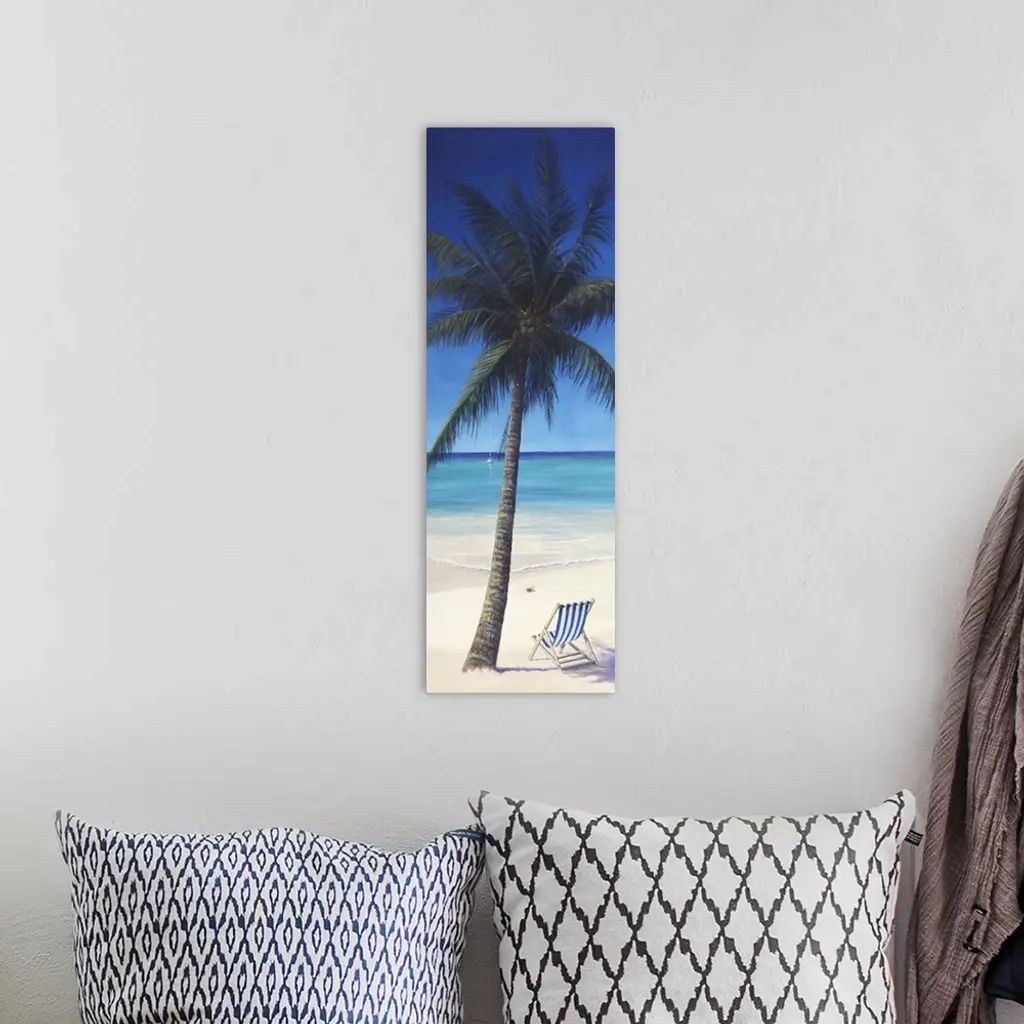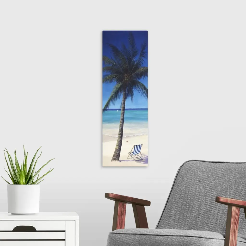 Contemporary artwork of a chair sitting next to a palm tree on a tropical beach.