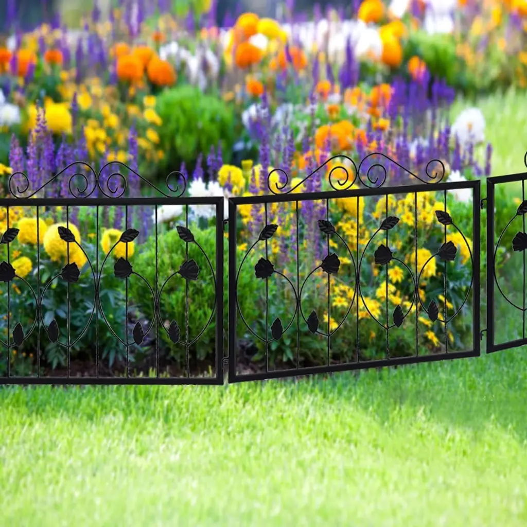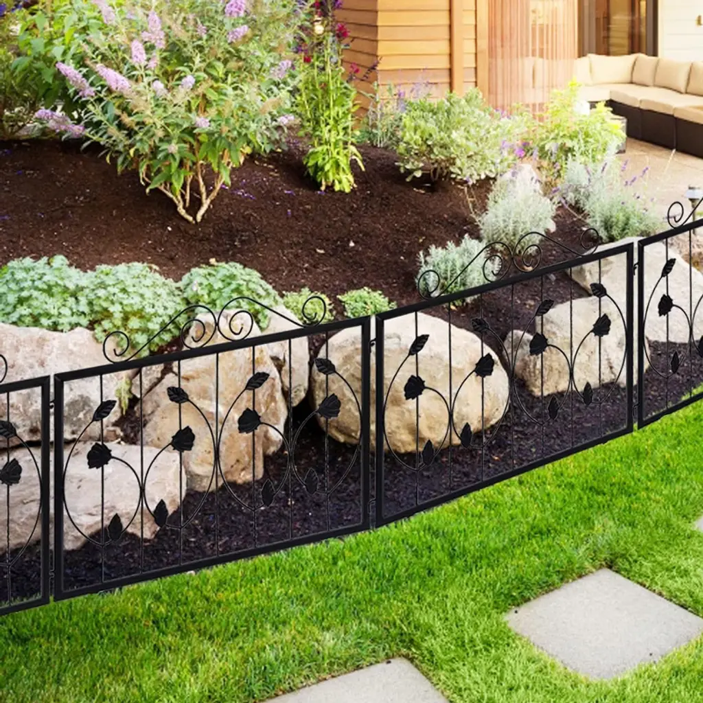 "4 Pack Decorative Garden Fence - 23.6in Rustproof Iron Border (Black)" - Elegant No-Dig Landscape SolutionPremium Features:Durable Construction2.5mm thick powder-coated iron for maximum rust resistanceReinforced welded joints at all connection pointsUV-resistant matte black finish lasts 8+ yearsWeatherproof design withstands rain, snow and sunVersatile ApplicationsCreates 31.6 linear feet of decorative border (4 panels)Perfect height (23.6") for flower beds and pathwaysScrollwork design adds Victorian charm to any gardenMulti-purpose use for yards, patios and landscapesEasy InstallationNo-dig design requires no tools or concretePre-assembled panels with ground stakes includedSimple interlocking system for quick setupAdjustable positioning for curved or straight bordersFunctional ProtectionEffective small animal barrier (rabbits, dogs)Keeps mulch and soil contained in garden bedsSturdy base prevents tipping in windOpen design allows plant growth and sunlightLow MaintenanceWipe clean with damp clothNo painting or sealing requiredStays looking new season after seasonEasy storage when not in useTechnical Specifications:Dimensions per panel: 23.6"H x 7.9'LMaterial: Powder-coated ironWeight per panel: 4.4 lbsColor: Matte BlackCoverage: 31.6 linear feet totalIncluded: 4 panels + 8 ground stakes