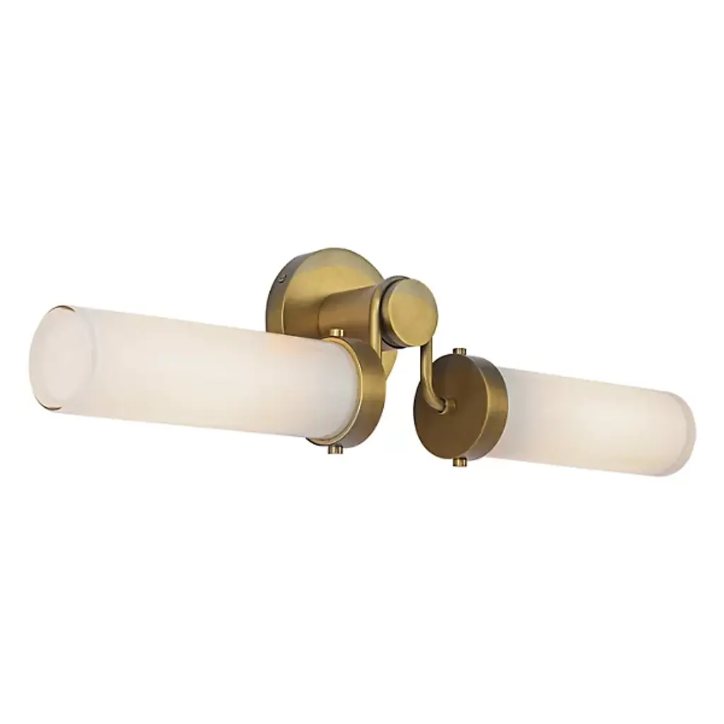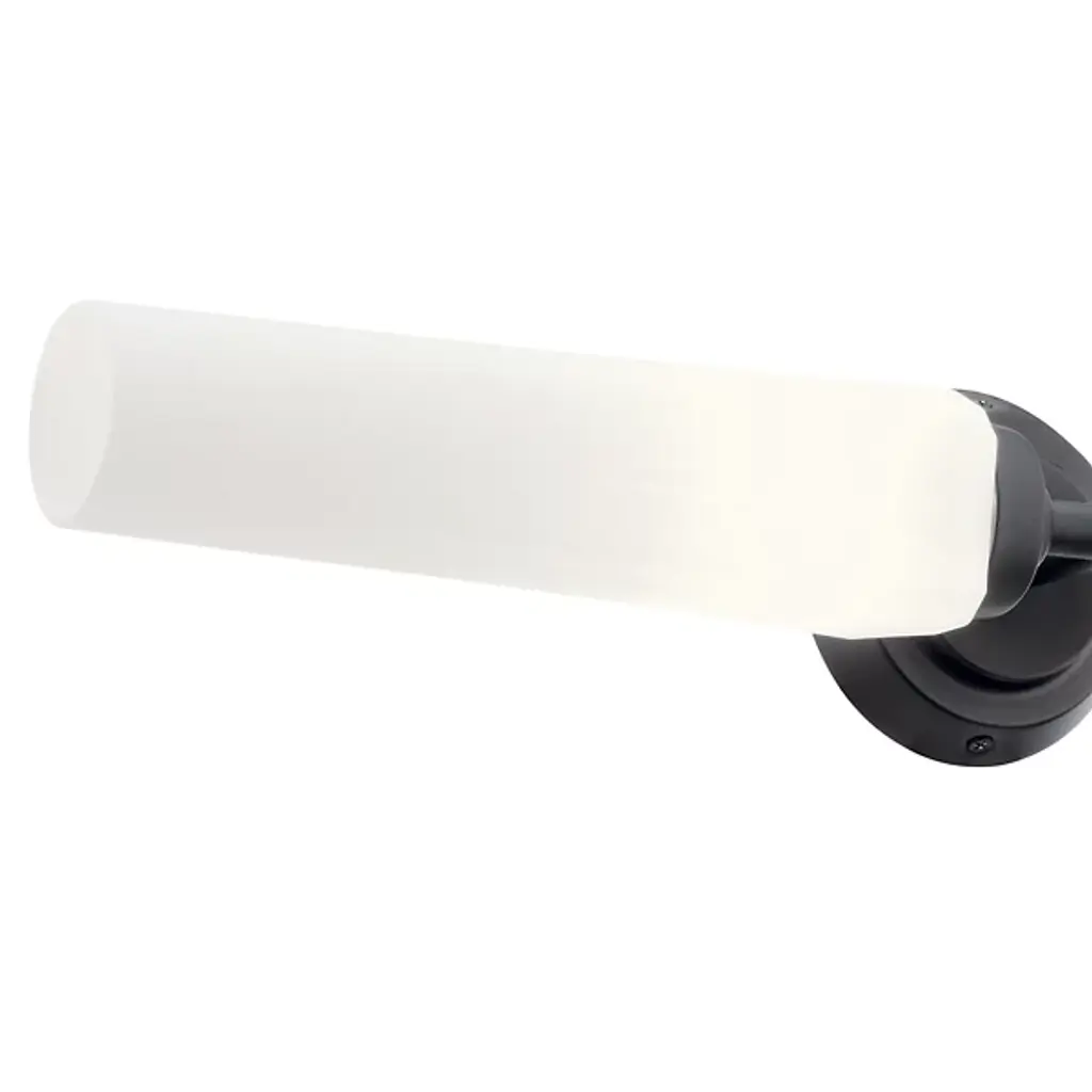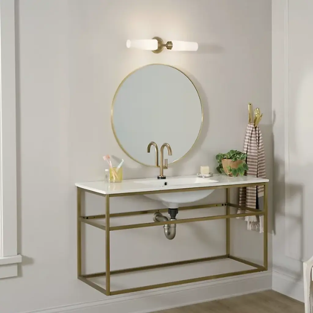 A simple piece that brings an emotional touch to the walls of your home. The Truby Vanity Light from Kichler shapes the décor by using a mix of smooth metal and glass to maximum effect. A round backplate starts the piece, allowing it to mount directly to the wall. A brief arm leads to a horizontal arm and a pair of lengthy, satin etched opal glass shades. Each shade contains a single bulb that brings the shade to life, emphasizing the subtle pattern on the surface as it illuminates the room. The Champagne Bronze finish offers a warm, muted brushed gold style and pairs beautifully with coordinating Delta® plumbing fixtures by Delta Faucet.