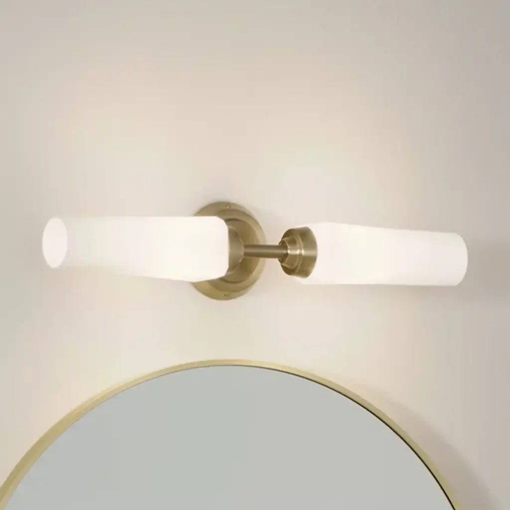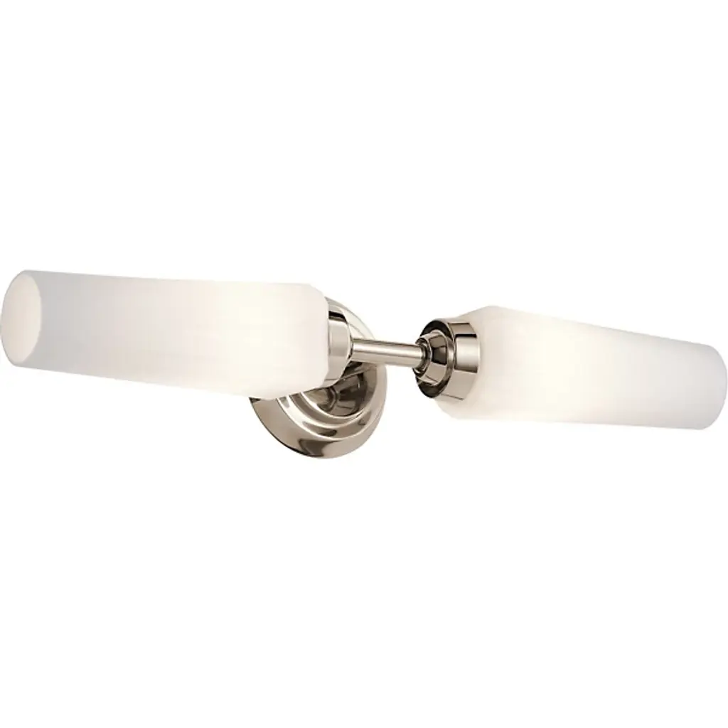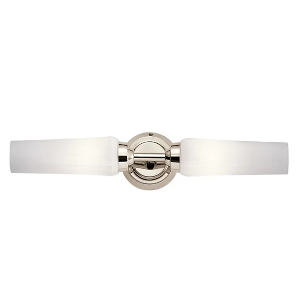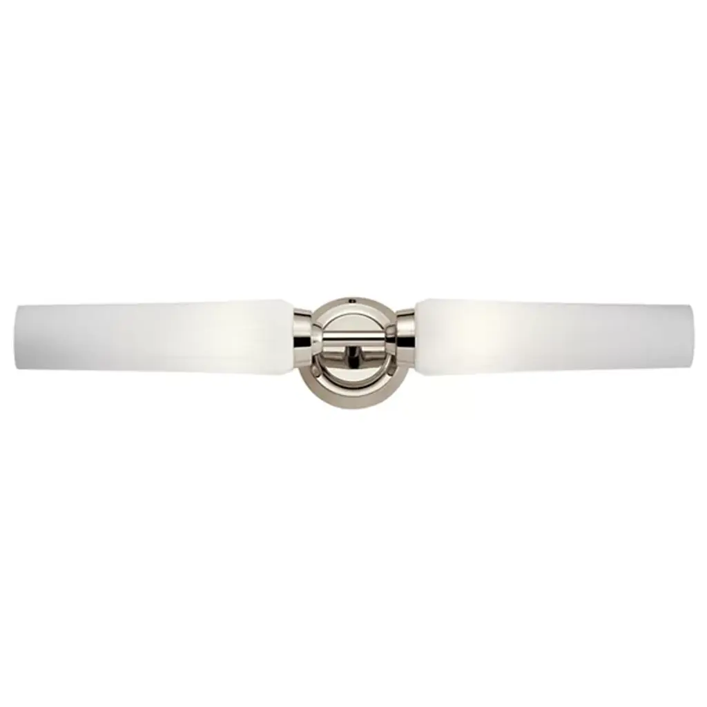 A simple piece that brings an emotional touch to the walls of your home. The Truby Vanity Light from Kichler shapes the décor by using a mix of smooth metal and glass to maximum effect. A round backplate starts the piece, allowing it to mount directly to the wall. A brief arm leads to a horizontal arm and a pair of lengthy, satin etched opal glass shades. Each shade contains a single bulb that brings the shade to life, emphasizing the subtle pattern on the surface as it illuminates the room. The Champagne Bronze finish offers a warm, muted brushed gold style and pairs beautifully with coordinating Delta® plumbing fixtures by Delta Faucet.