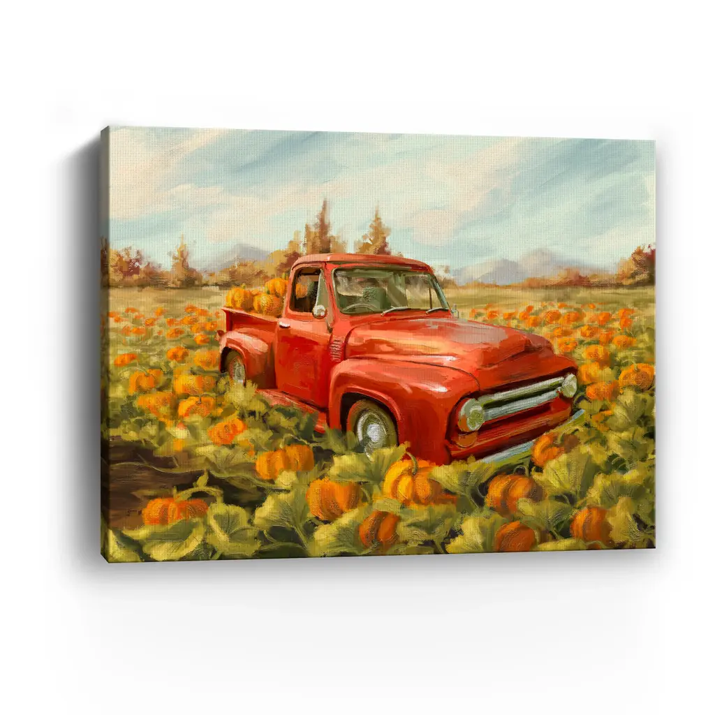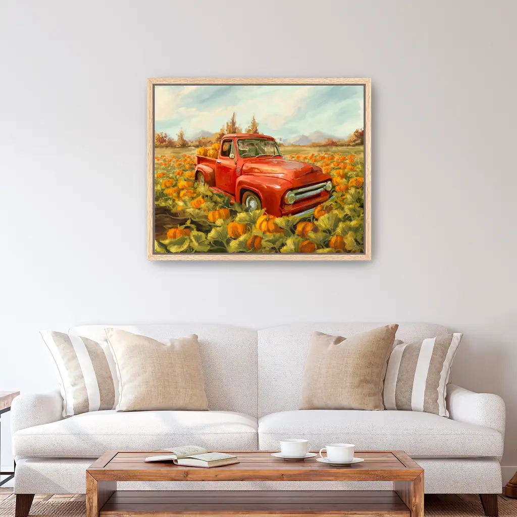 Truck And Pumpkin Field Canvas Giclee - Framed / Oak / 24x30