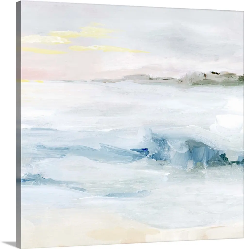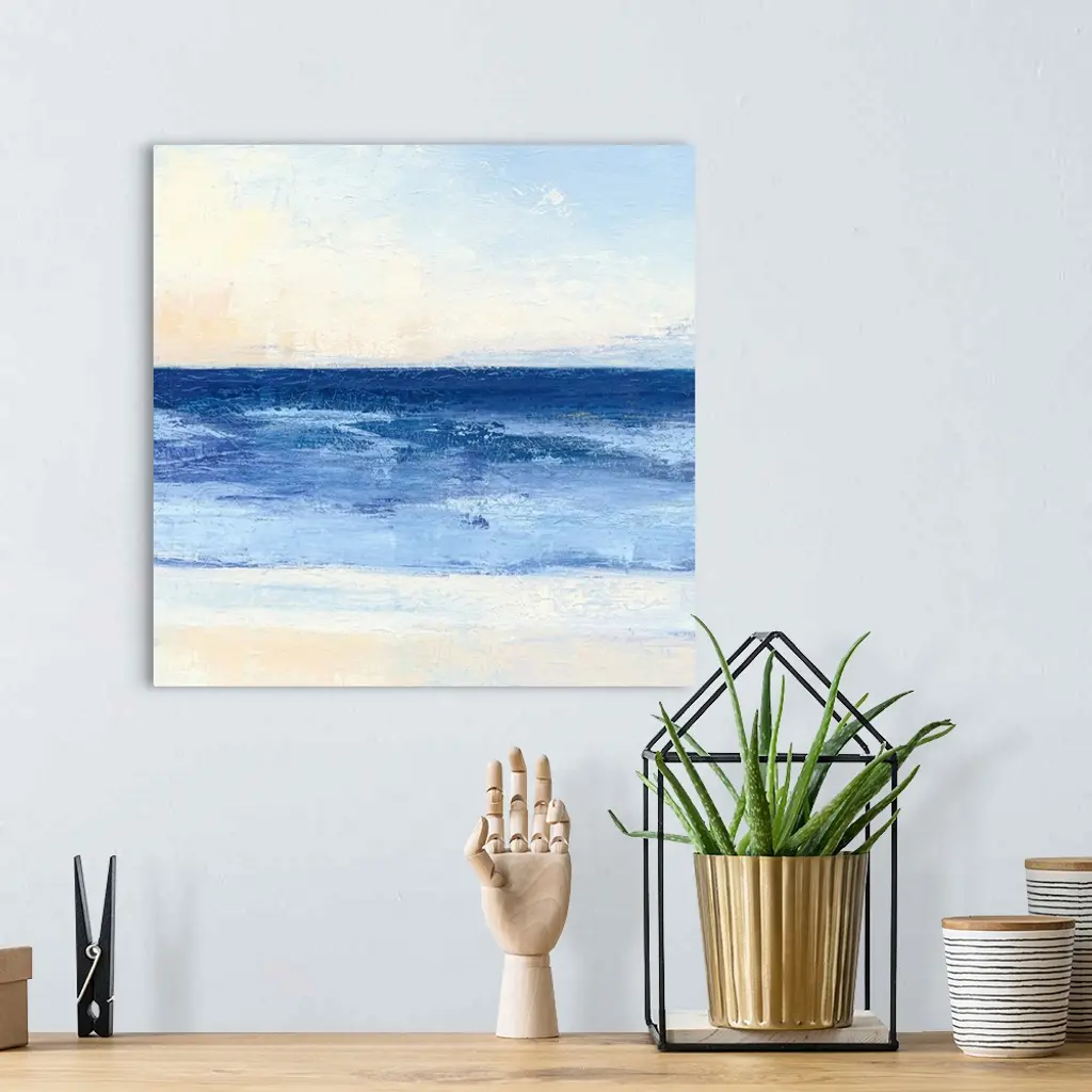 Contemporary coastal themed painting of a calm sea seen from a beach shoreline.
