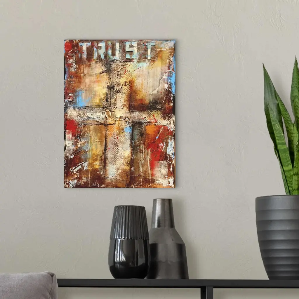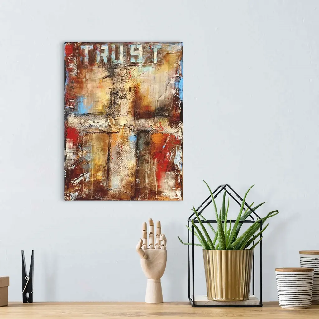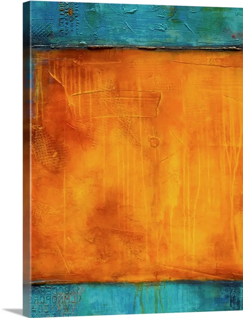 Contemporary color field style painting using stencil lettering and grungy earth tones.