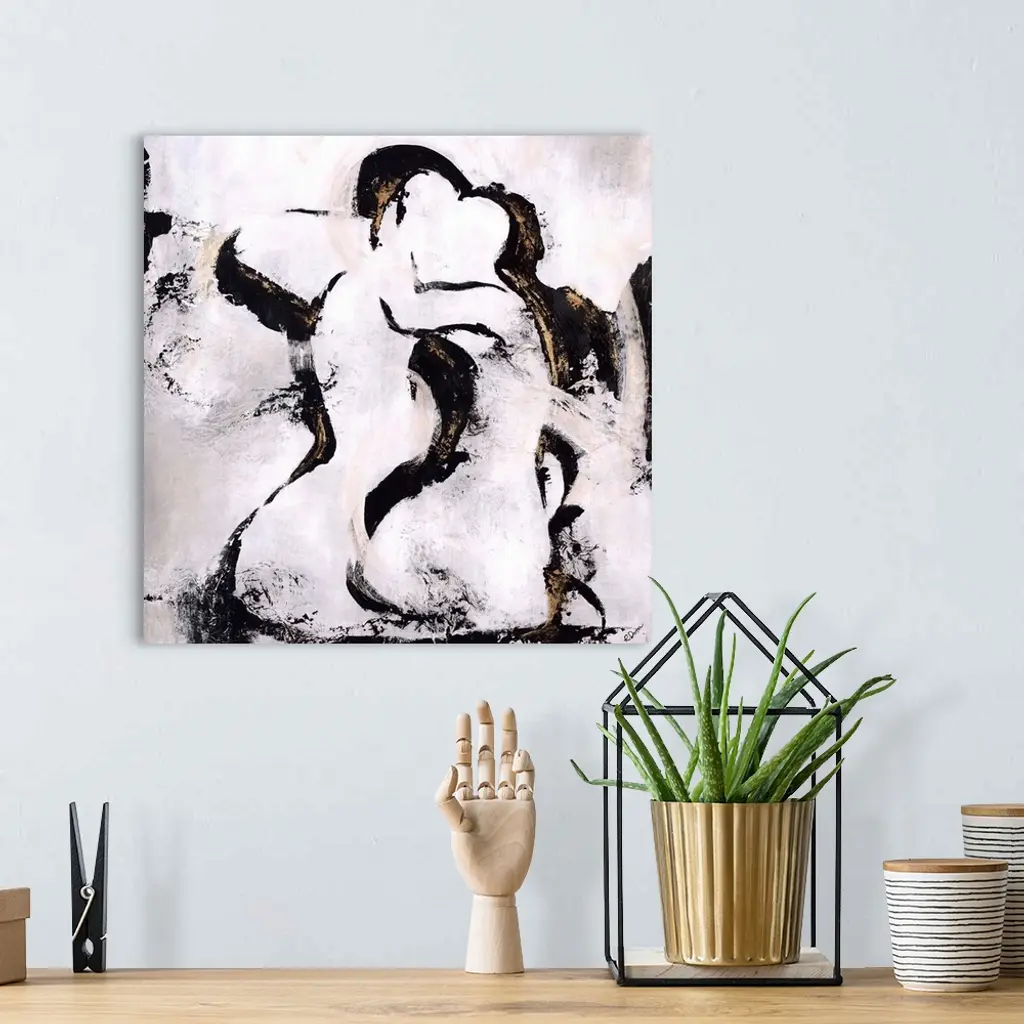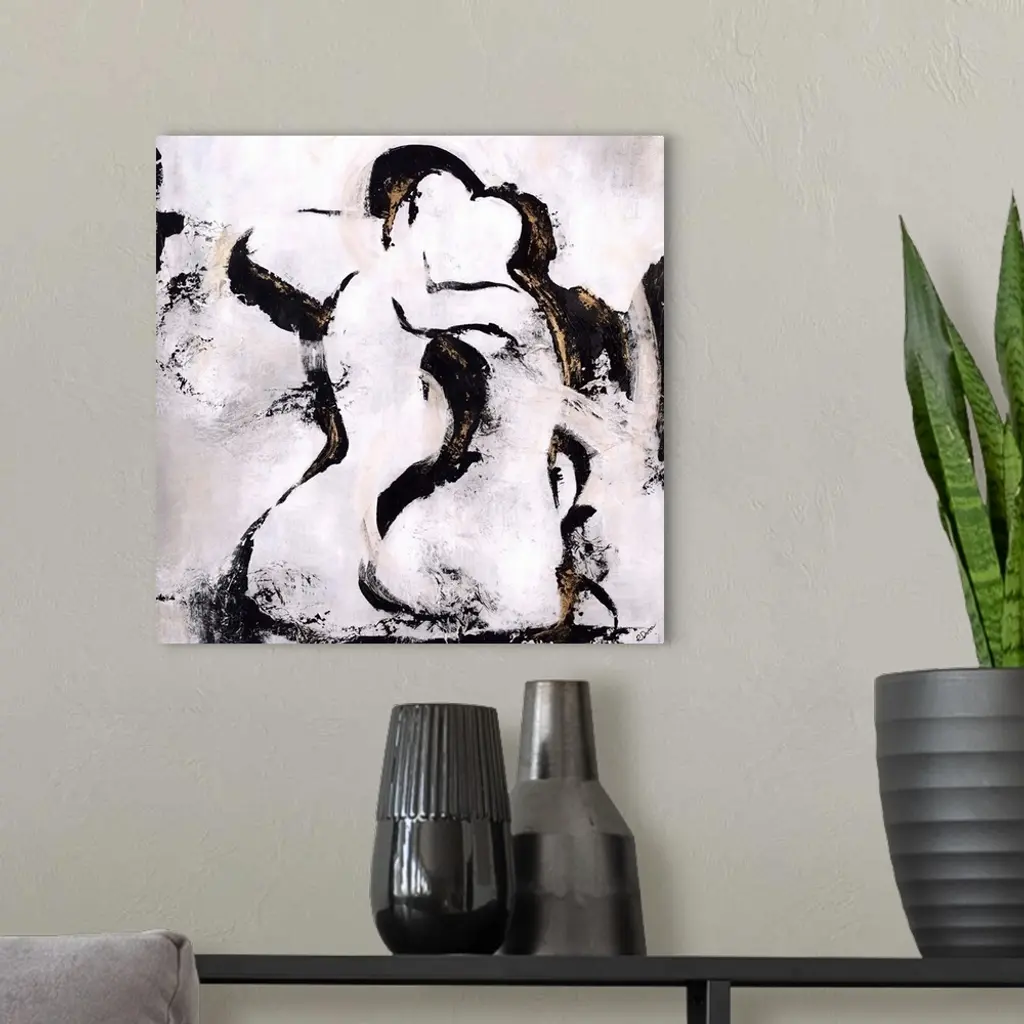 Abstract painting using harsh black paint strokes in contrast with the light background bringing shape to what appears to be two figures embracing one another.