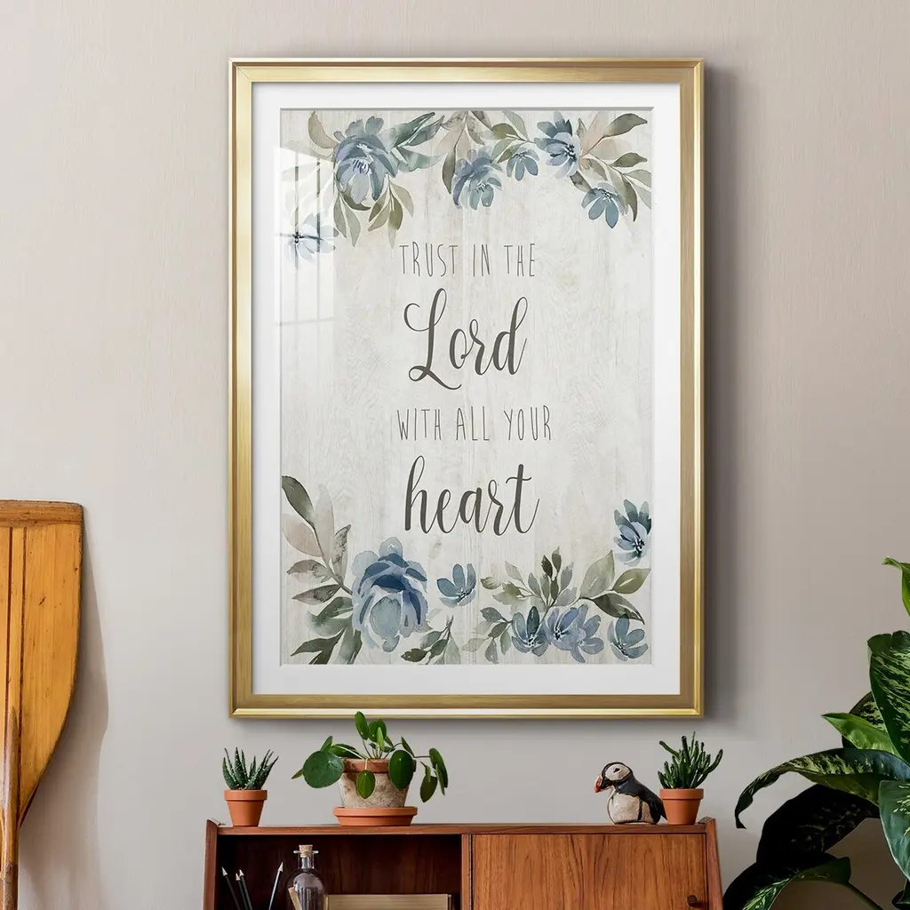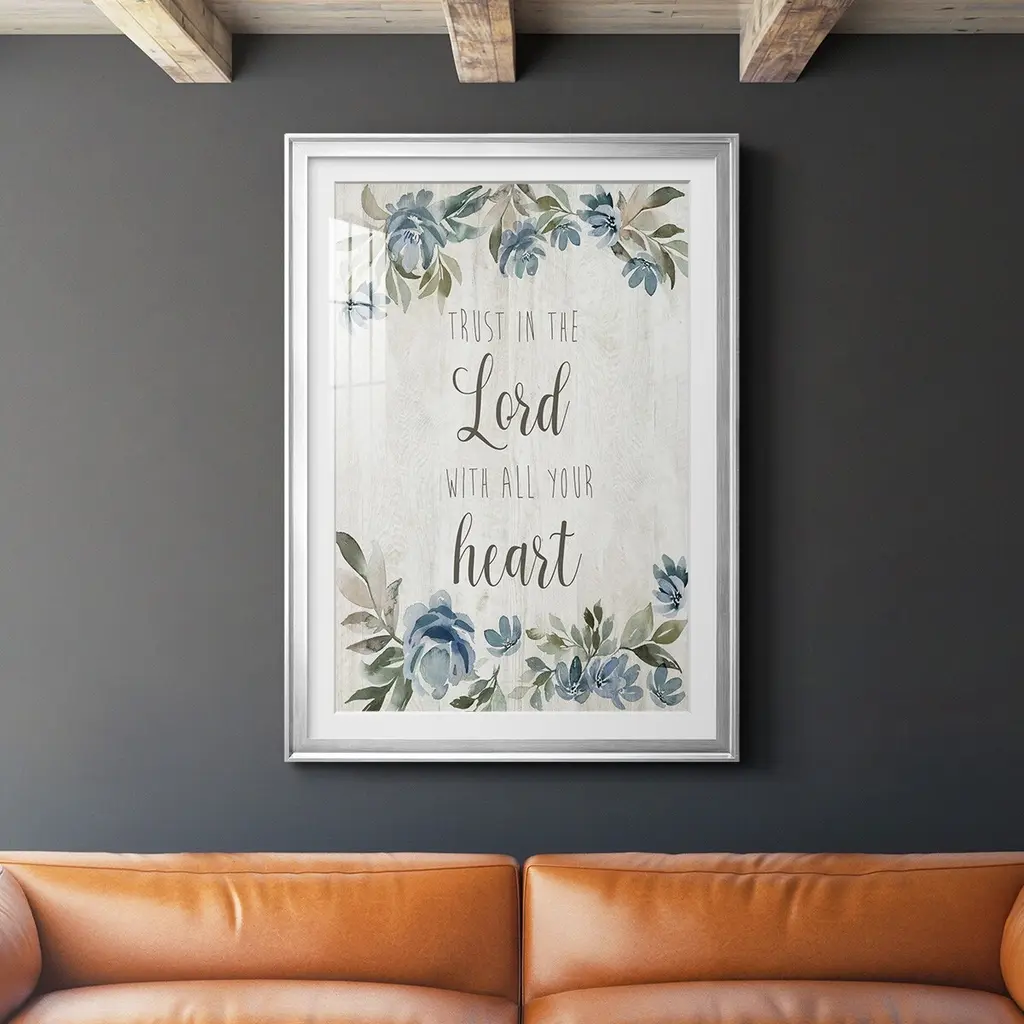 Trust in the Lord Premium Framed Print - Ready to Hang A Premium Framed Print created to last. Framed in distressed wood and available in an array of sizes and colors Featuring a beveled a solid wood stretcher bar, each piece comes ready to hand 4 SIZES AVAILABLE 30.5''X42.5'' - Overall Size 26.5'X36.5'' - Overall Size 22.5''x30.5'' - Overall Size 18.5''x24.5'' - Overall Size Each piece is made to order. Each piece comes with hanging hardware. Made in the USA Ready to Hang Giclee Paper Print Acrylic Glass Beveled Matt Board