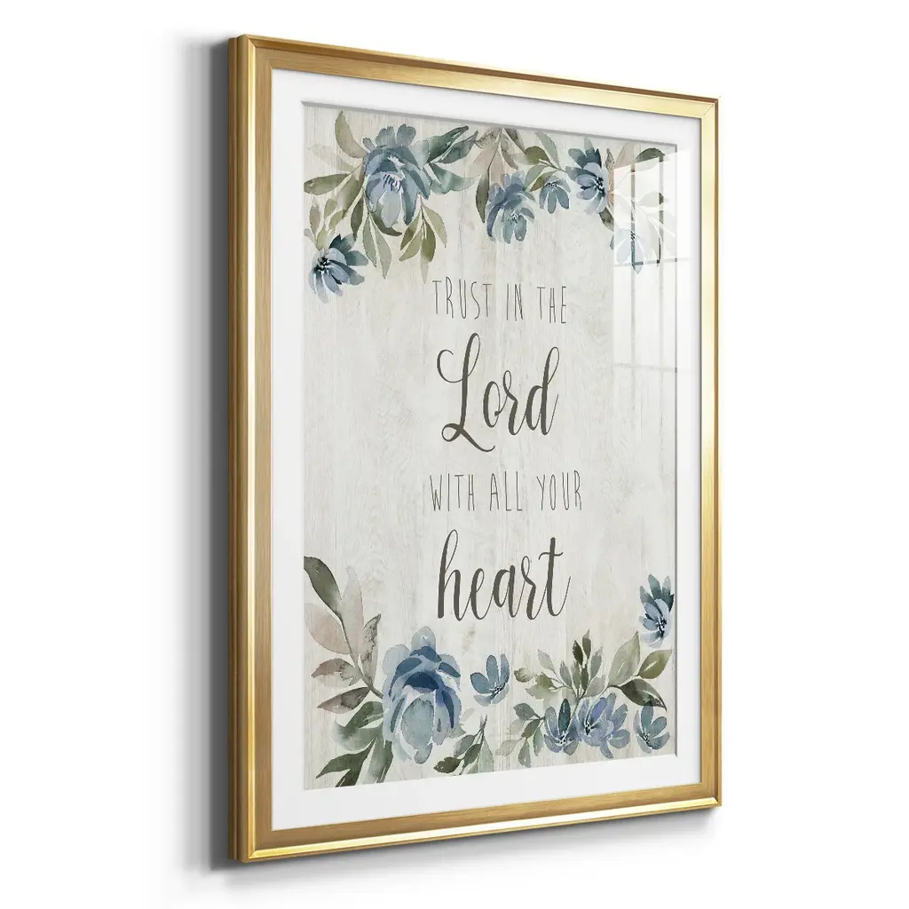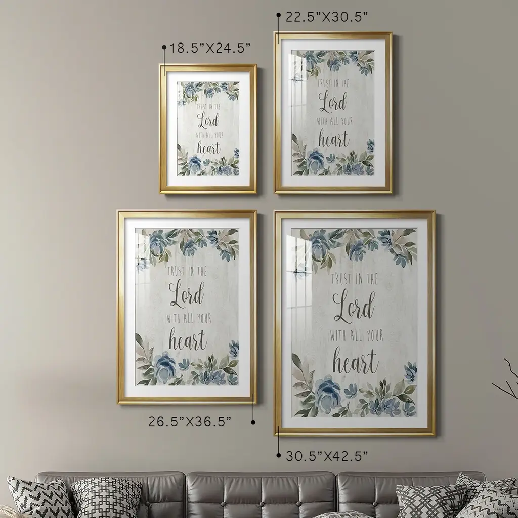 Trust in the Lord Premium Framed Print - Ready to Hang A Premium Framed Print created to last. Framed in distressed wood and available in an array of sizes and colors Featuring a beveled a solid wood stretcher bar, each piece comes ready to hand 4 SIZES AVAILABLE 30.5''X42.5'' - Overall Size 26.5'X36.5'' - Overall Size 22.5''x30.5'' - Overall Size 18.5''x24.5'' - Overall Size Each piece is made to order. Each piece comes with hanging hardware. Made in the USA Ready to Hang Giclee Paper Print Acrylic Glass Beveled Matt Board
