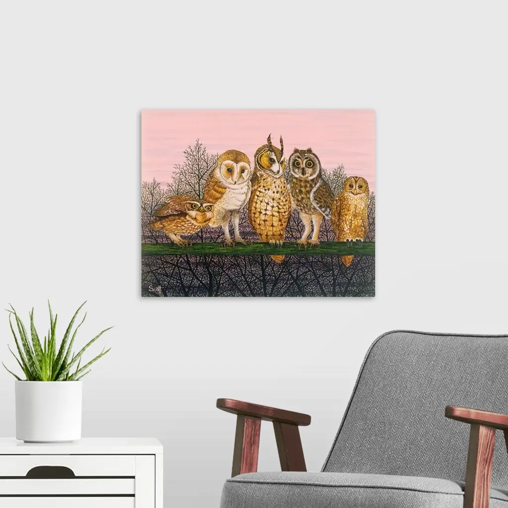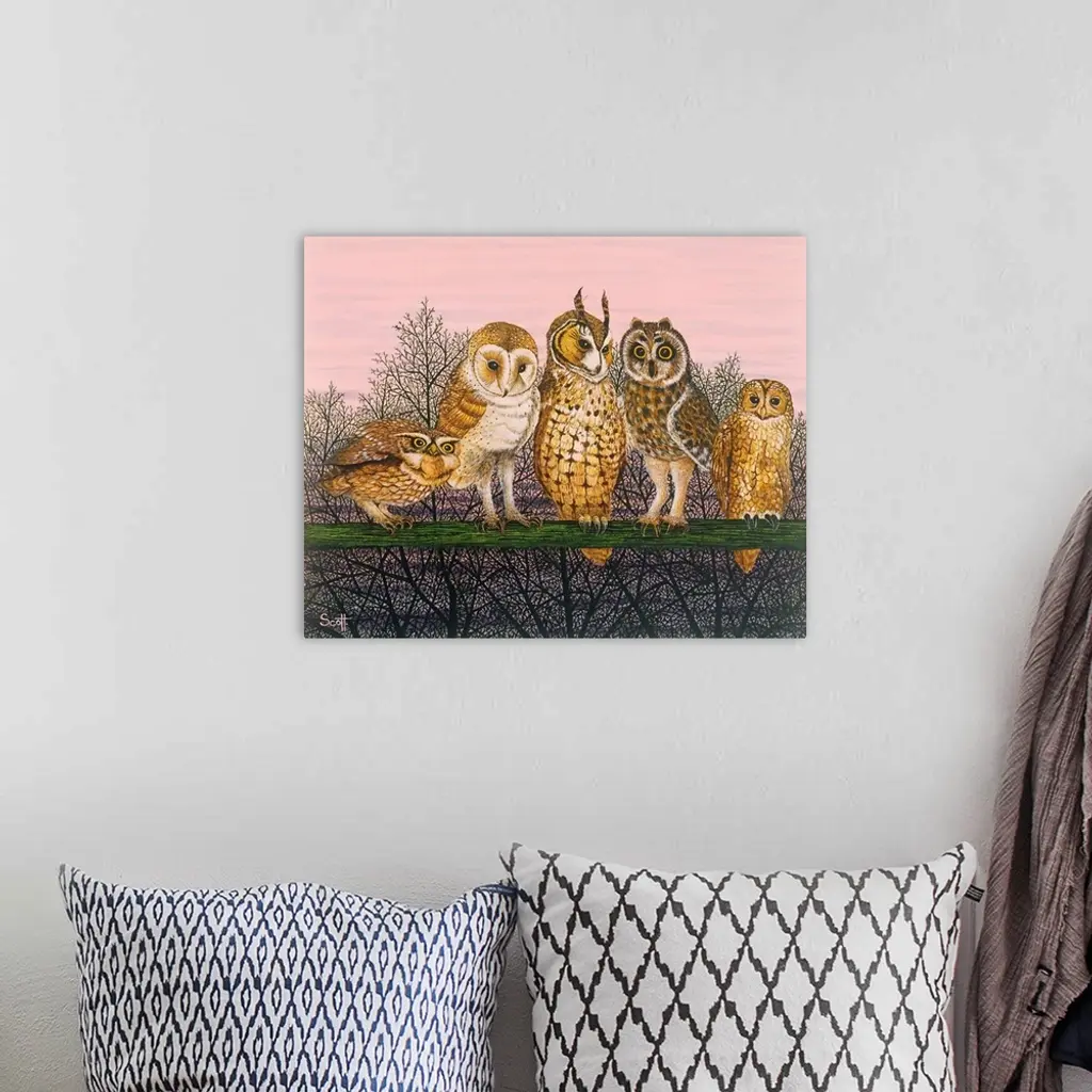 Contemporary painting of five different species of owl.
