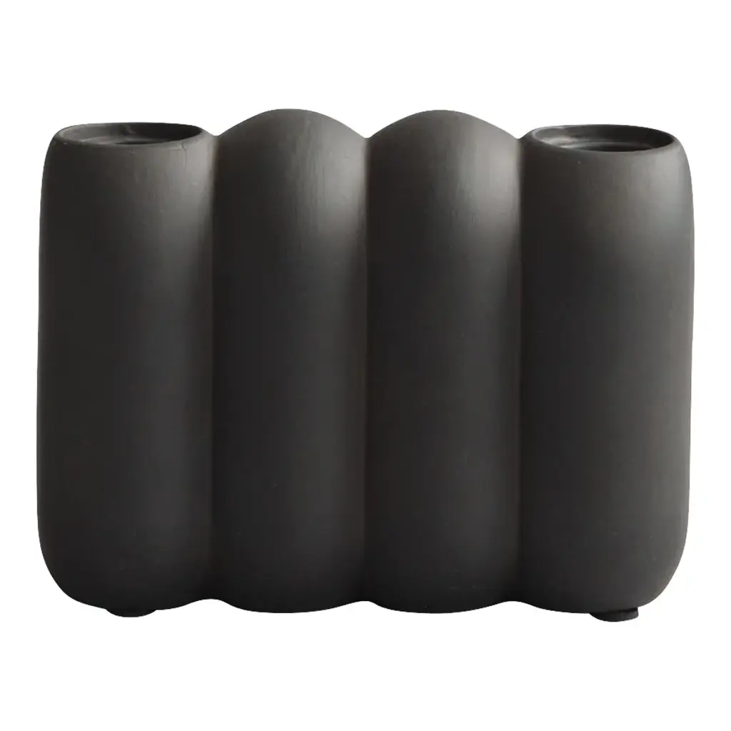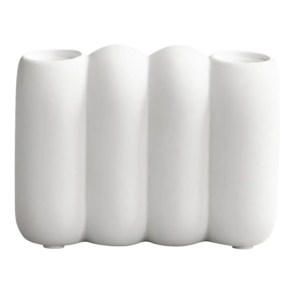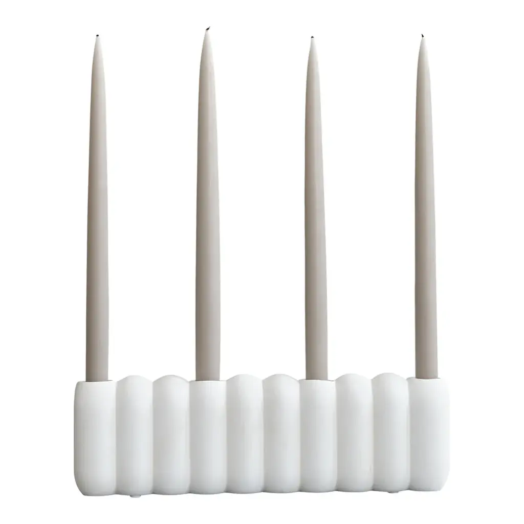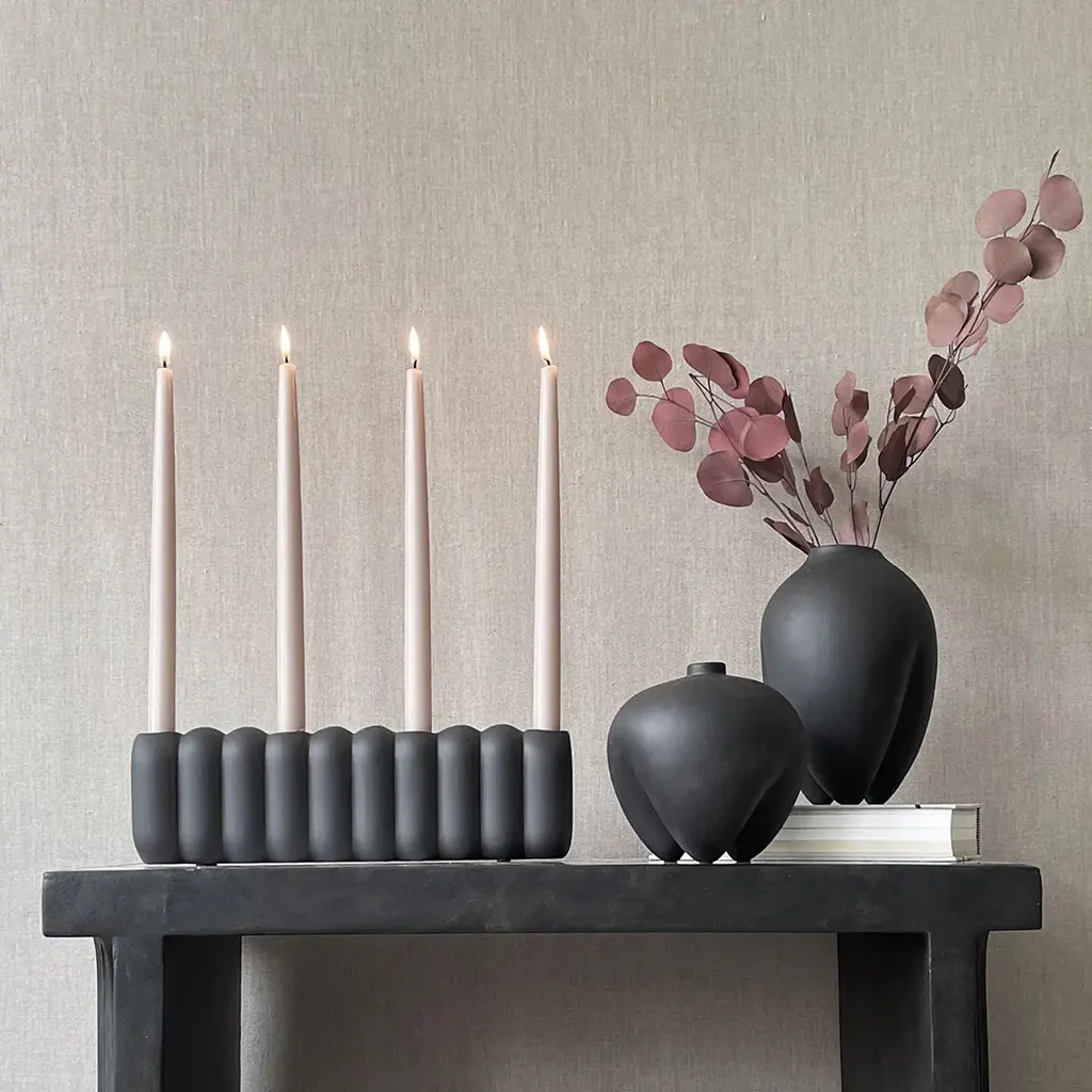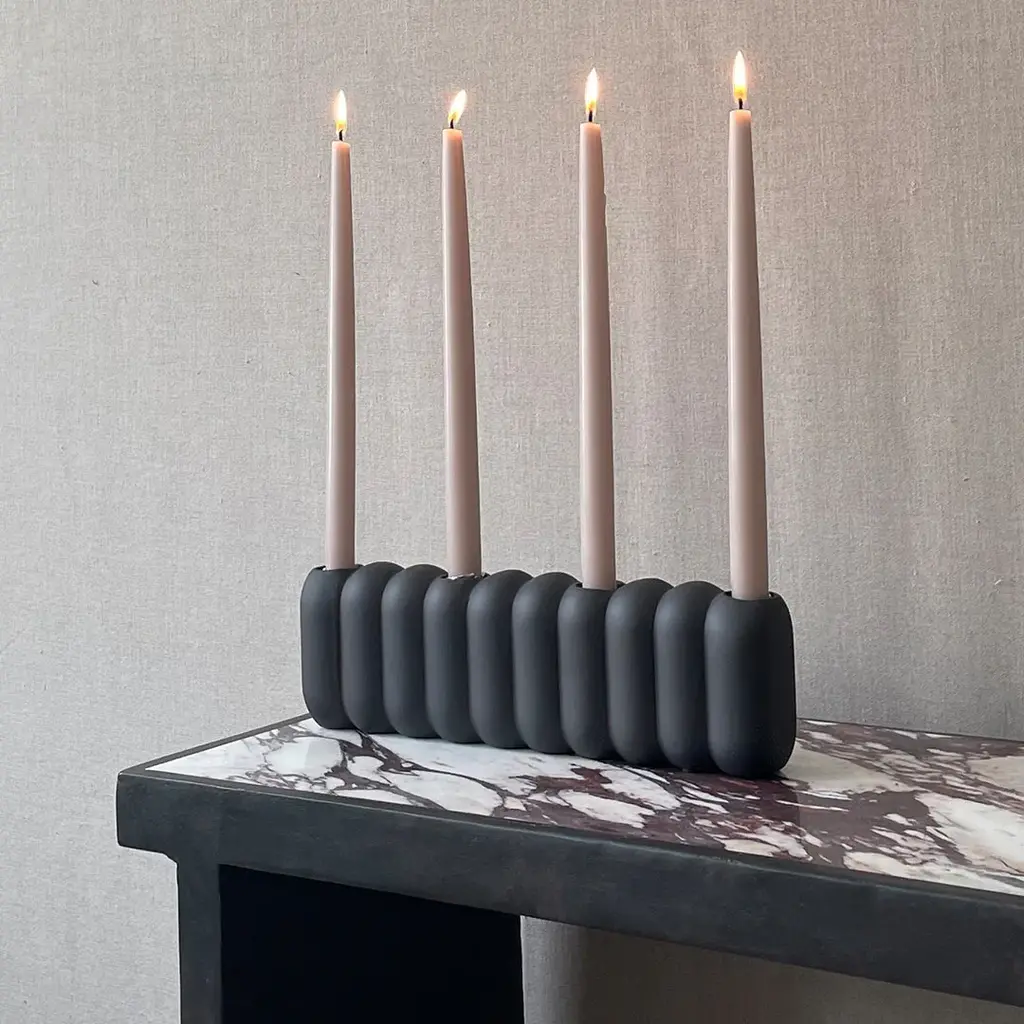 A series of ceramic lamellas, the Tube Candle Holders is all about repetition as a minimalistic sculptural detail. Inspired by 70's sculptural artwork and design, tube is based on a single oval shape, repeating itself into a continuous sculptural object. Tube comes in two different sizes, with two candles or four candles. The candle holders are made of ceramic and as it is a hand glazed natural product, the colours may vary slightly. Designed by Kristian Sofus Hansen & Tommy Hyldahl.