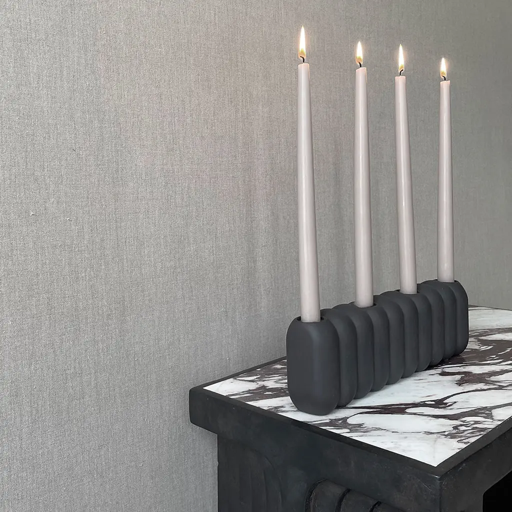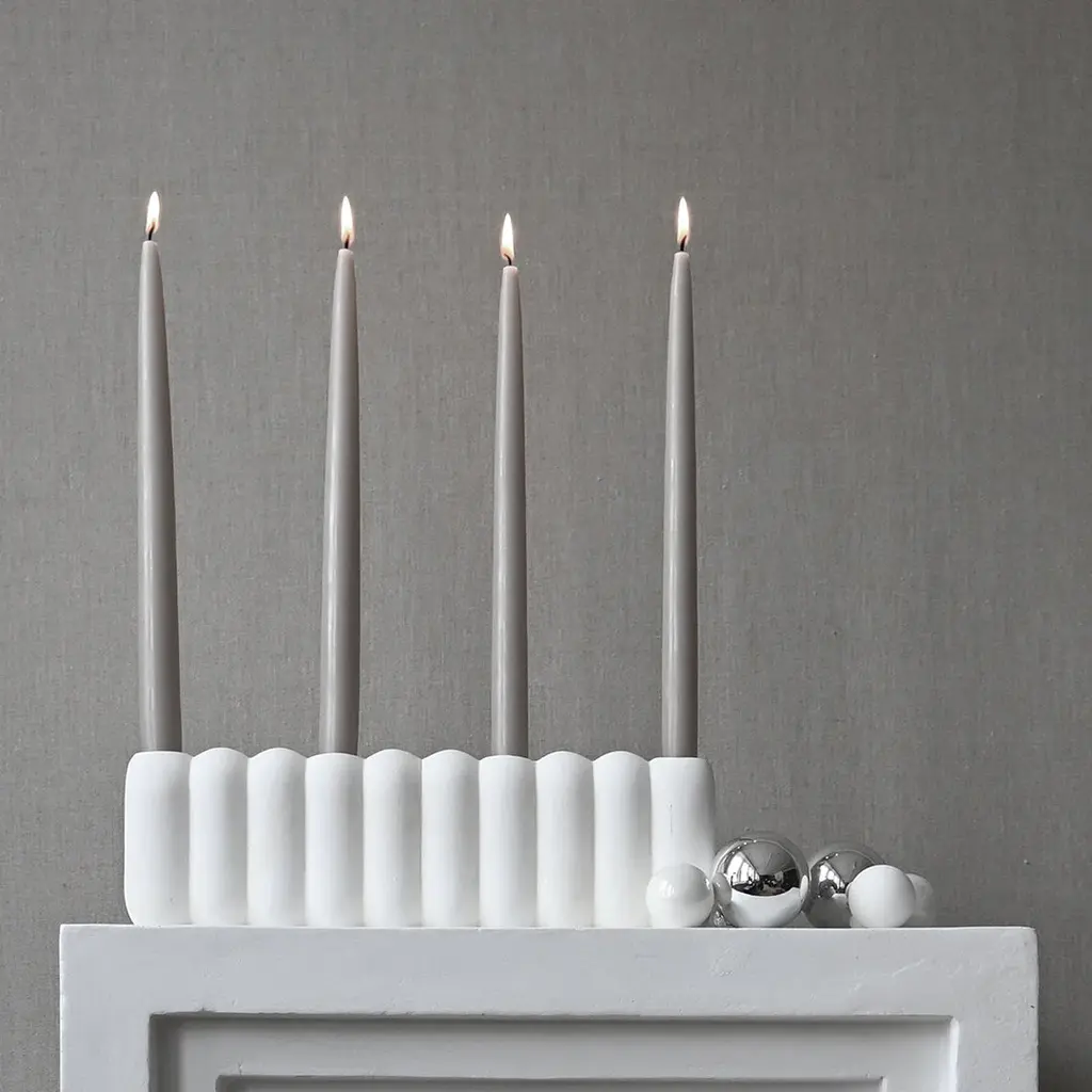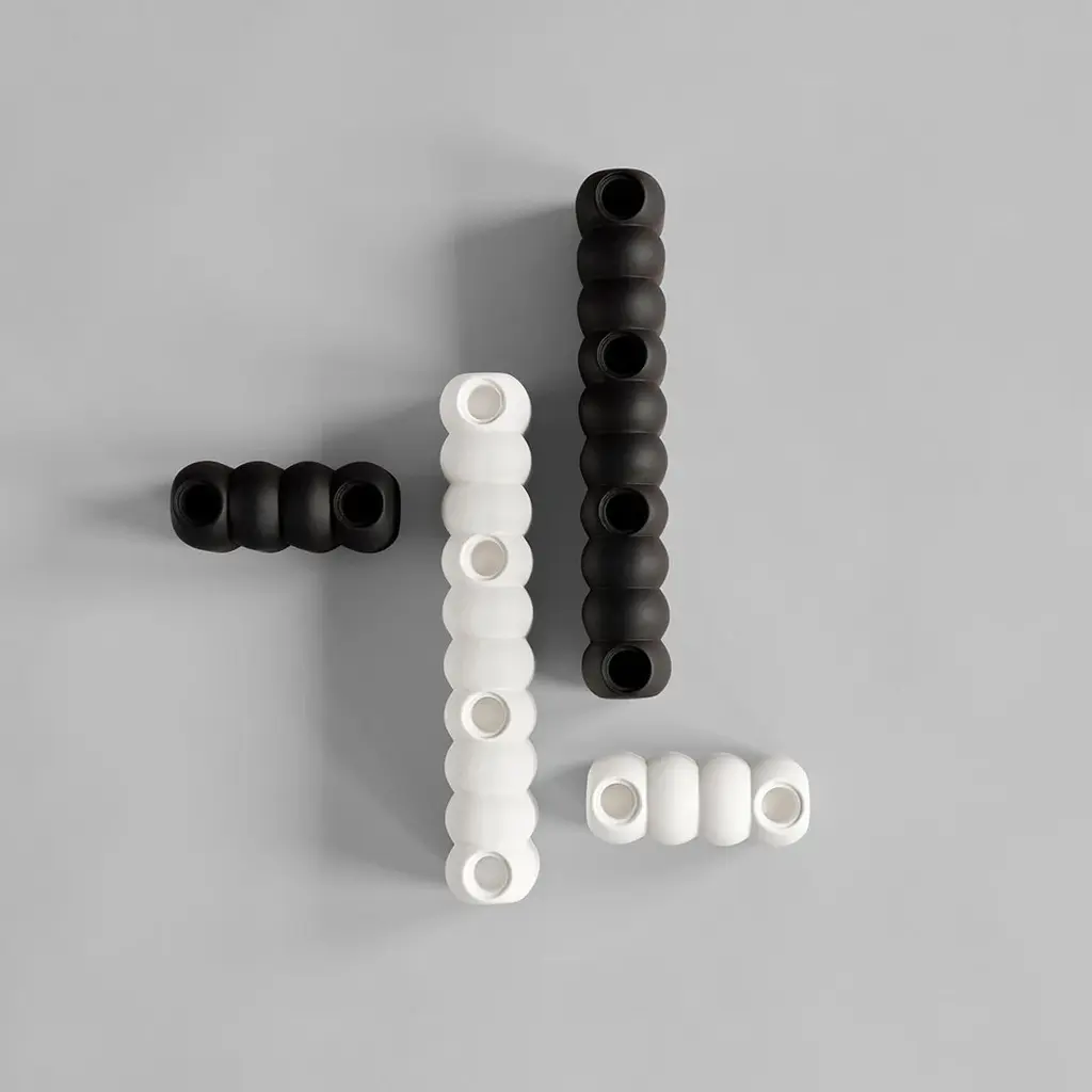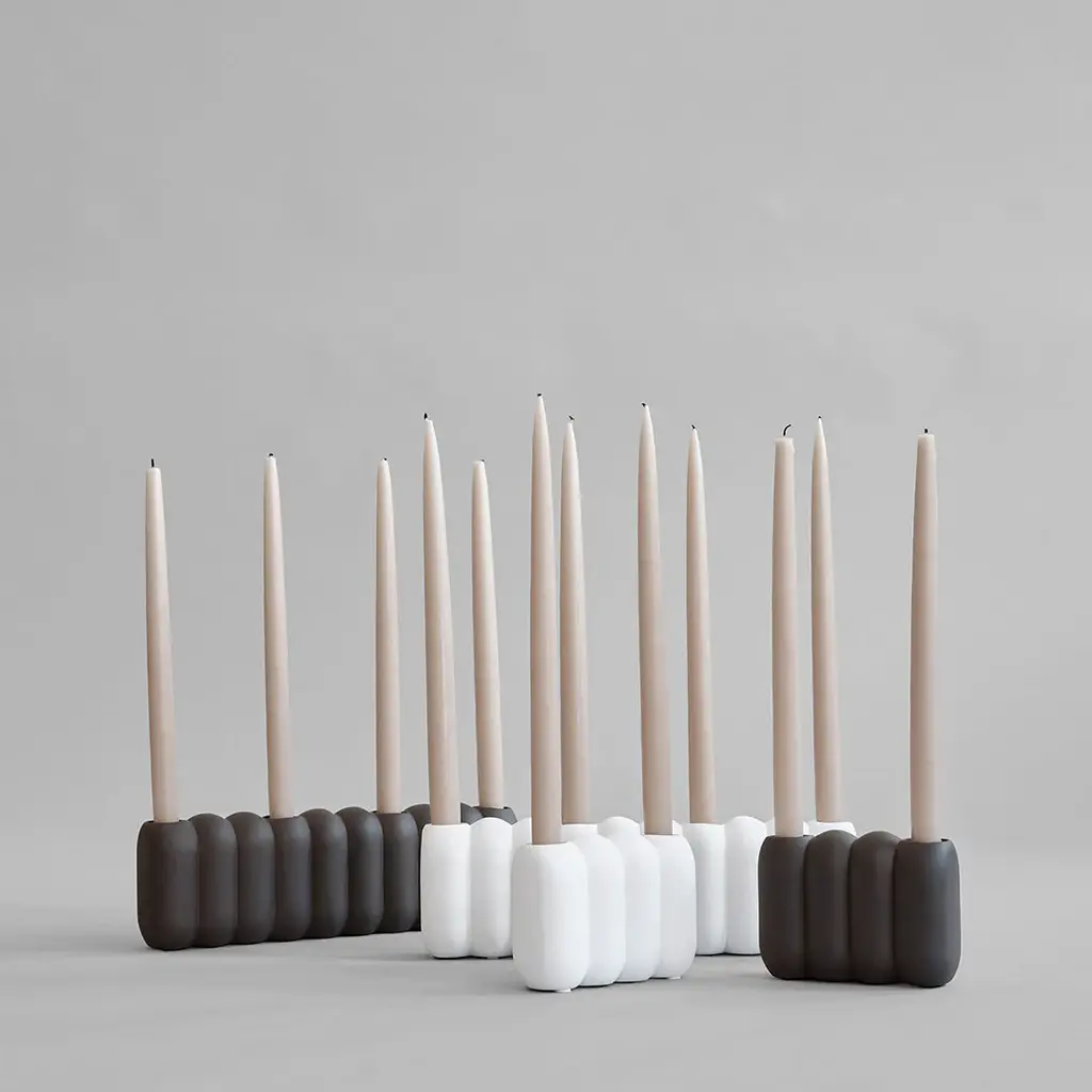 A series of ceramic lamellas, the Tube Candle Holders is all about repetition as a minimalistic sculptural detail. Inspired by 70's sculptural artwork and design, tube is based on a single oval shape, repeating itself into a continuous sculptural object. Tube comes in two different sizes, with two candles or four candles. The candle holders are made of ceramic and as it is a hand glazed natural product, the colours may vary slightly. Designed by Kristian Sofus Hansen & Tommy Hyldahl.
