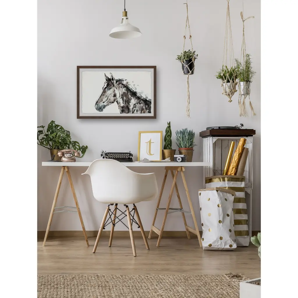 Within this frame floats a watercolor print of a horse. Side profile, the white stripe down the face is just barely visible with a speckled brown coat. The style makes it seem the horse is moving. This piece is printed on high quality archive paper and professionally hand-framed. With wall-mounting hooks included, this artful accent is ready to hang up as soon as it reaches your front door. • Top quality Giclee print on high resolution Archive Paper • Hand cut deckled edges • High quality durable non-warping frame • Finished under shatter resistant plexiglass • Arrives ready to hang • Includes a certificate of authenticity • Printed in the USA